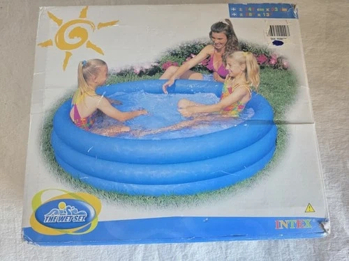 Cool off in retro style with this vintage 2001 Intex “The Wet Set” blue three-ring inflatable pool! A classic backyard favorite, this durable vinyl pool is perfect for kids or collectors of nostalgic Intex and 2000s-era pool toys.