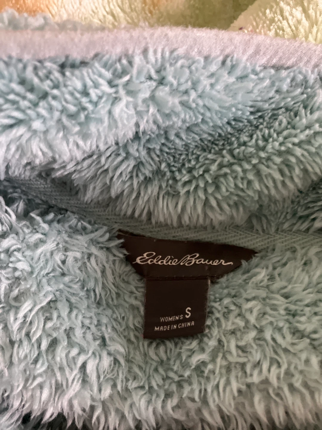 This is an Eddie Bauer women's fleece pullover in a soft, light blue colour. It's a size small with a snap-button collar and pockets on the sides. This comfy sweater is perfect for staying warm on cooler days!