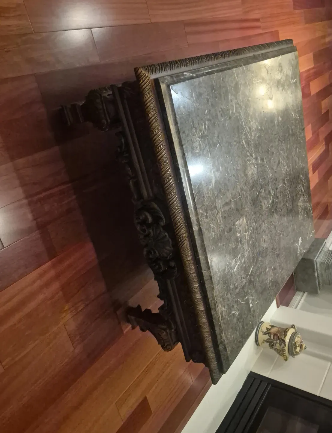 Ornate Marble Top Console Table with Carved Wood Base