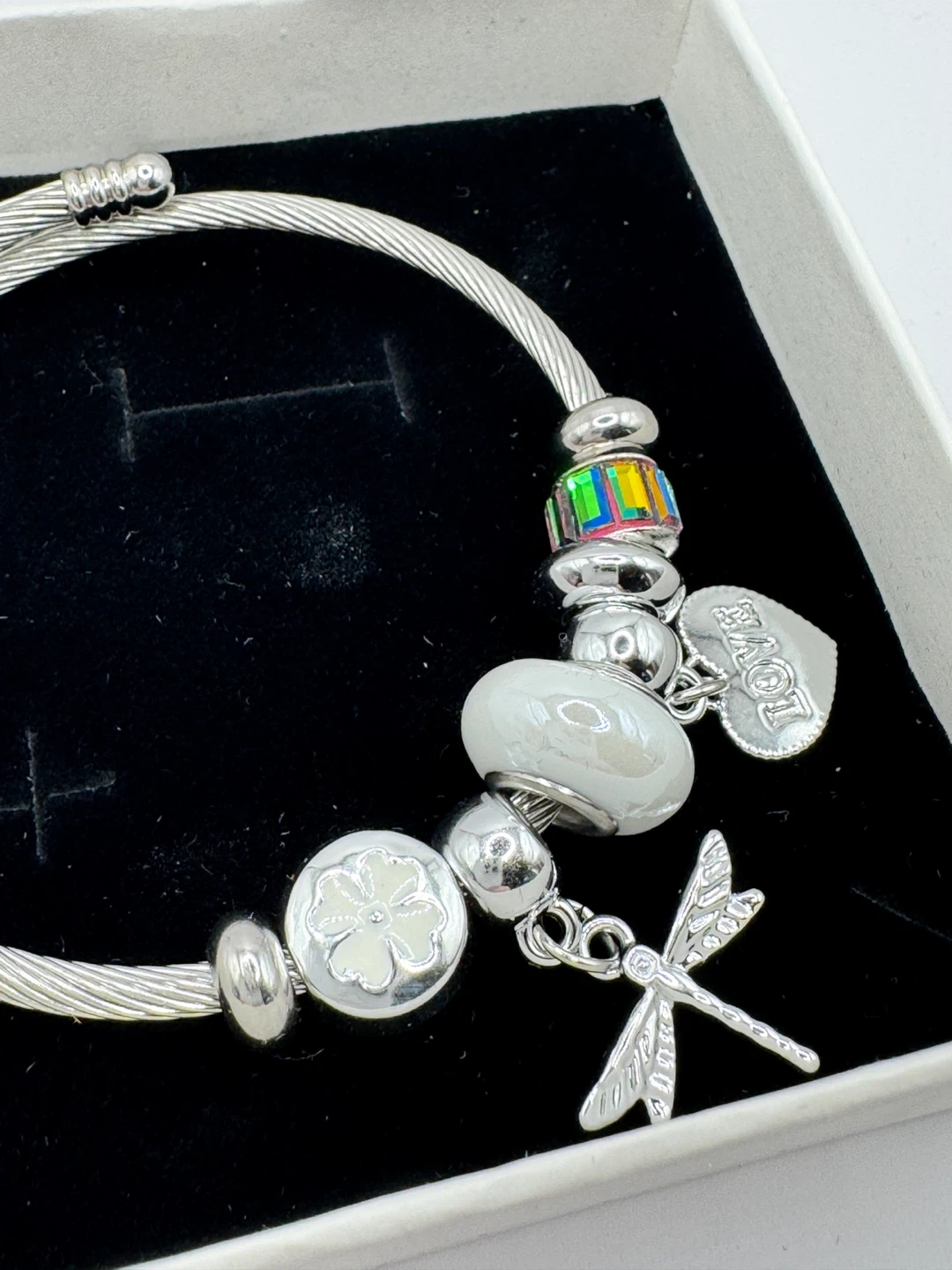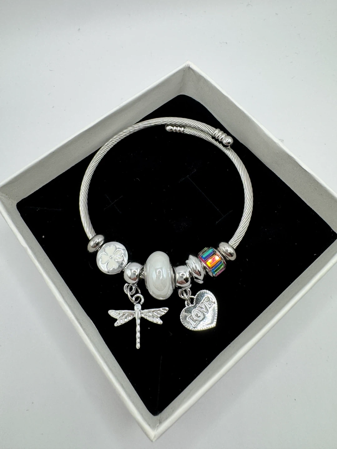 This is a silver-tone bangle bracelet adorned with several charms. It features a dragonfly, a clover with a white enamel centre, a large white bead, and a heart-shaped pendant engraved with 'LOVE'. A colourful rectangular bead adds a pop of colour. The bracelet comes presented in a white gift box.