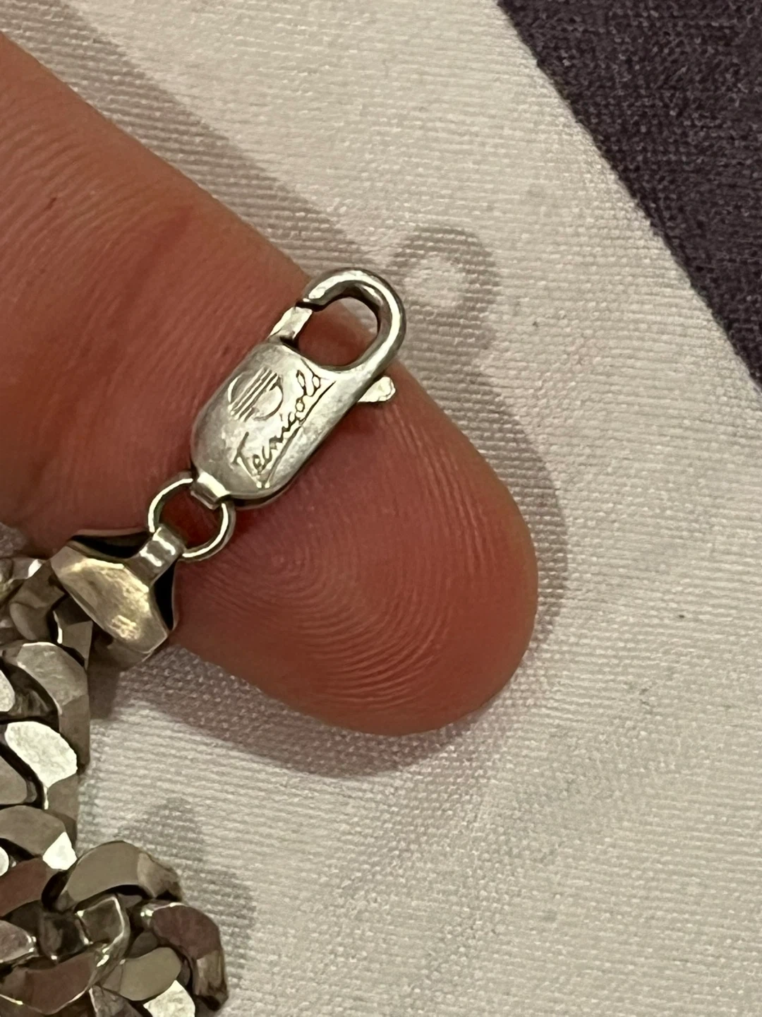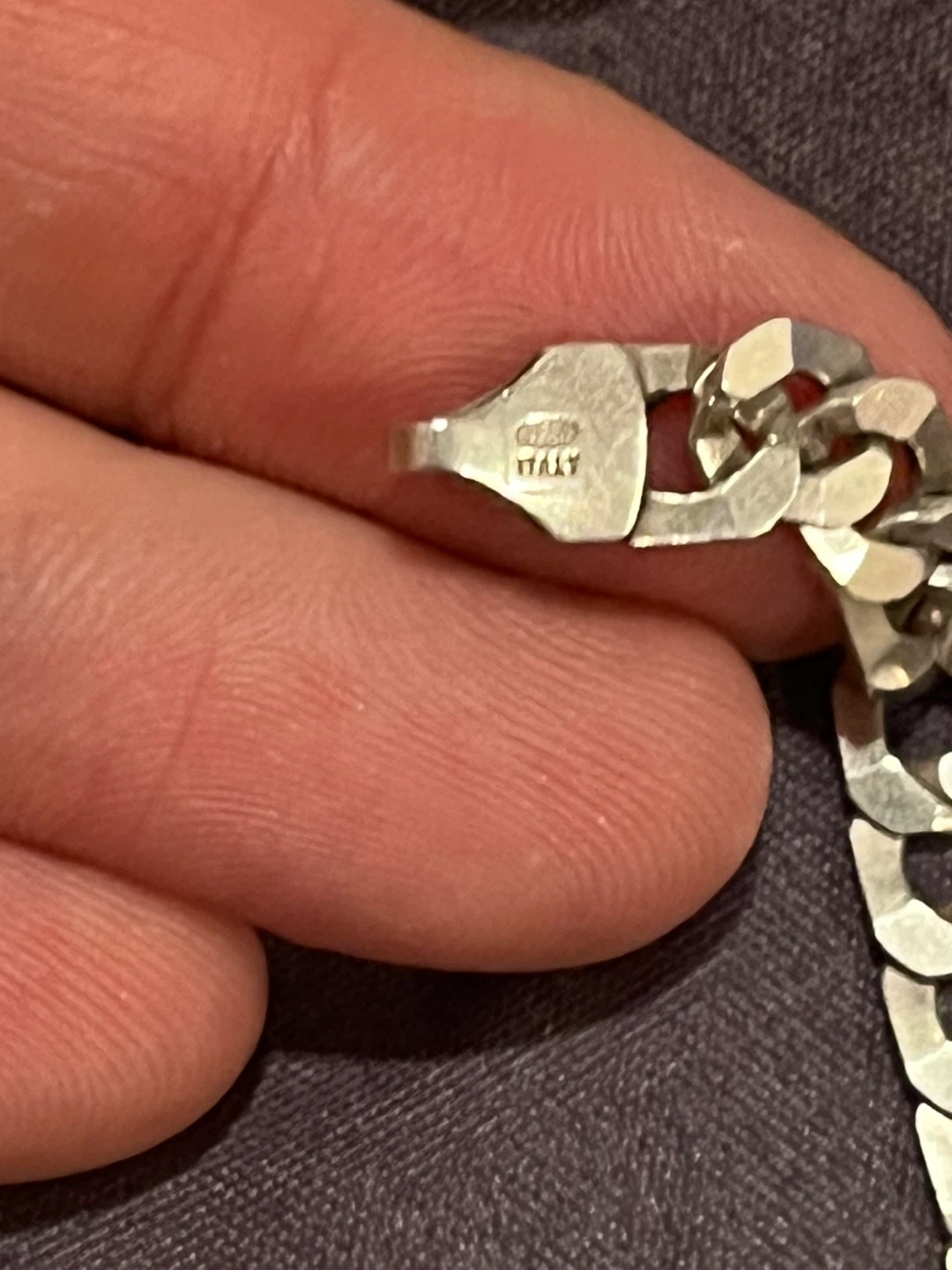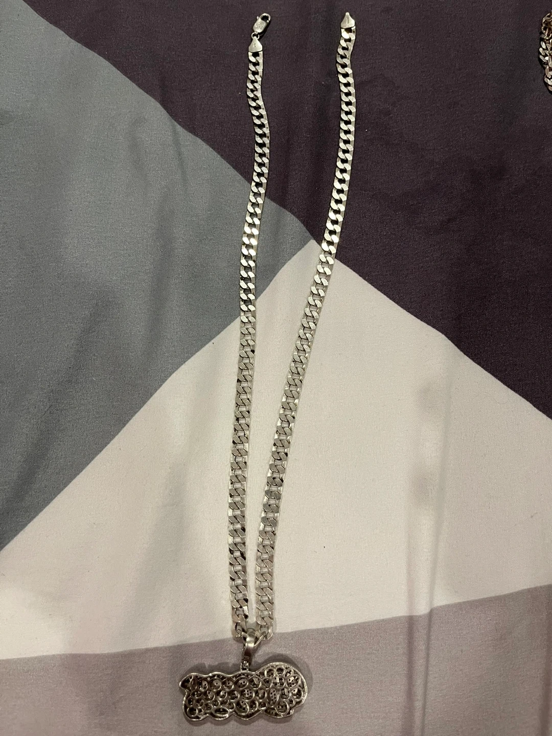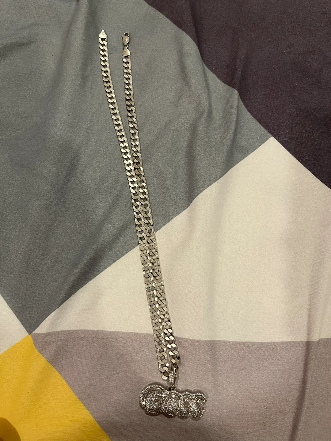 This necklace features a sterling silver chain with a "BOSS" pendant. It's stamped "925 ITALY" on the clasp. The chain's design is a cuban curb link.