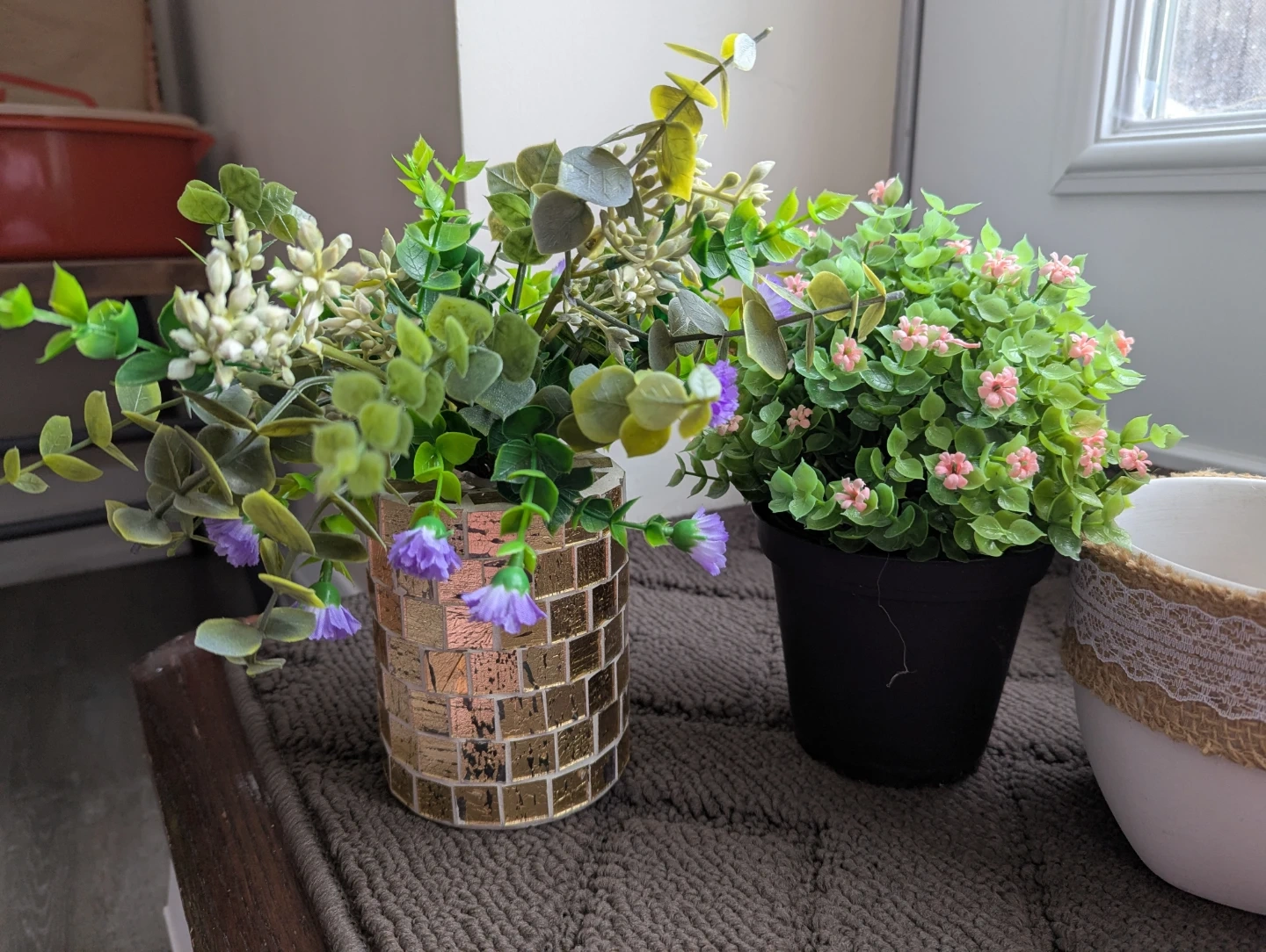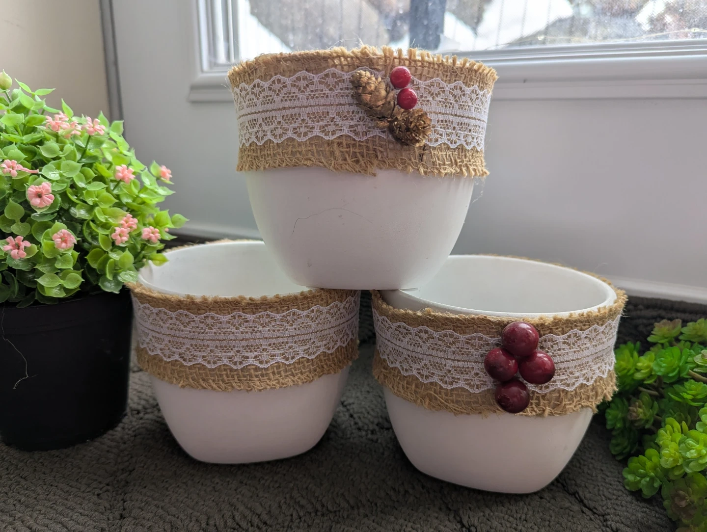 - 3 white ceramic planters, each decorated with burlap and lace trim and berry accents.