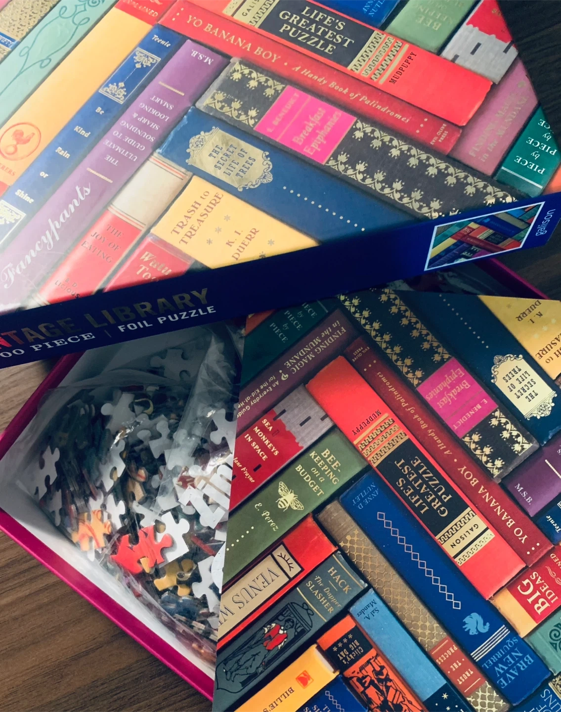 This 1000-piece jigsaw puzzle features a "Vintage Library" design with foil accents. It's made with 90% recycled paper and printed with nontoxic inks. The completed puzzle measures 20" x 27". Is complete, and comes with a poster.