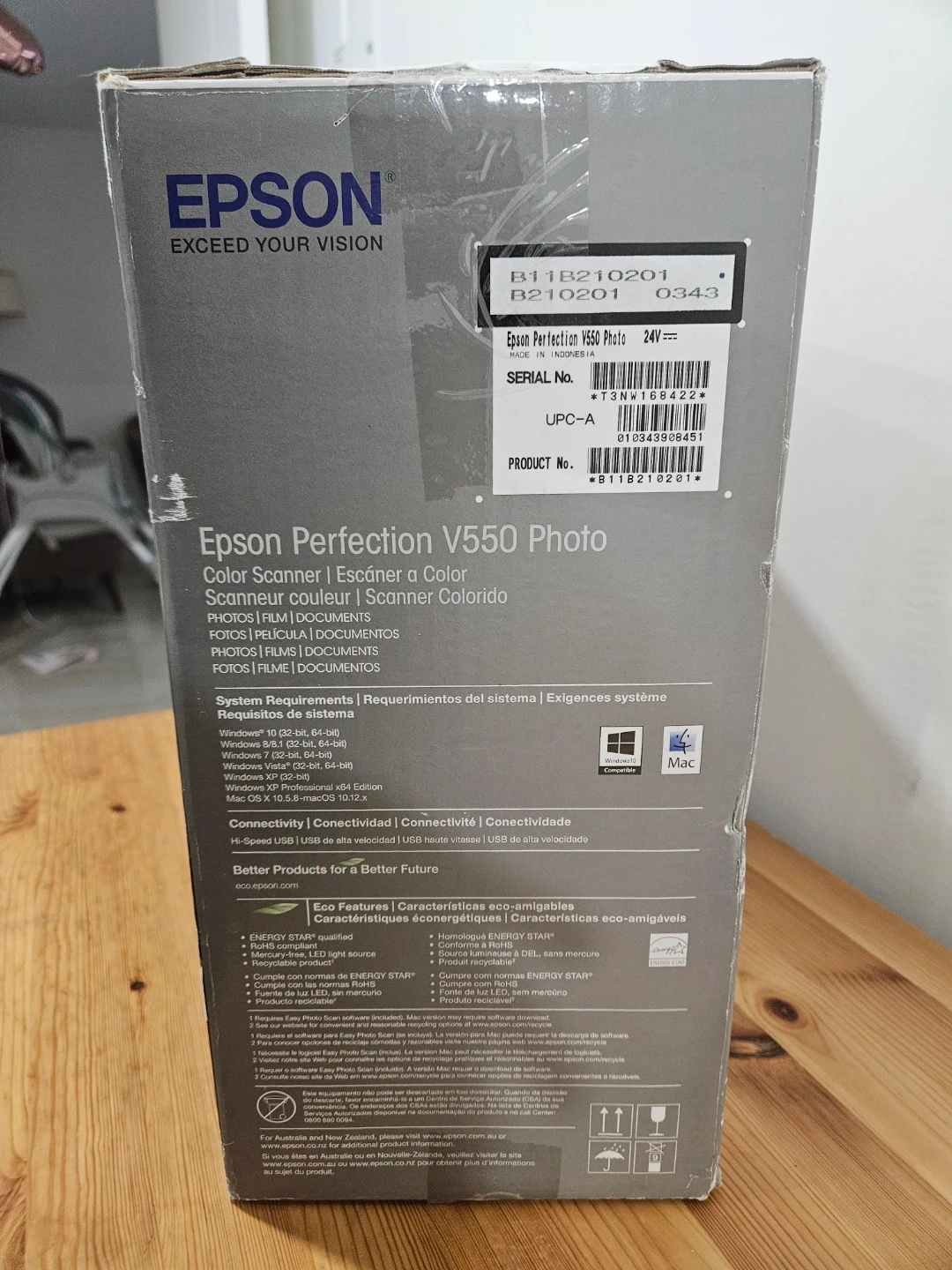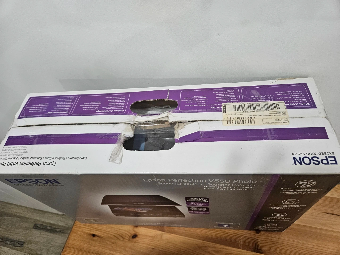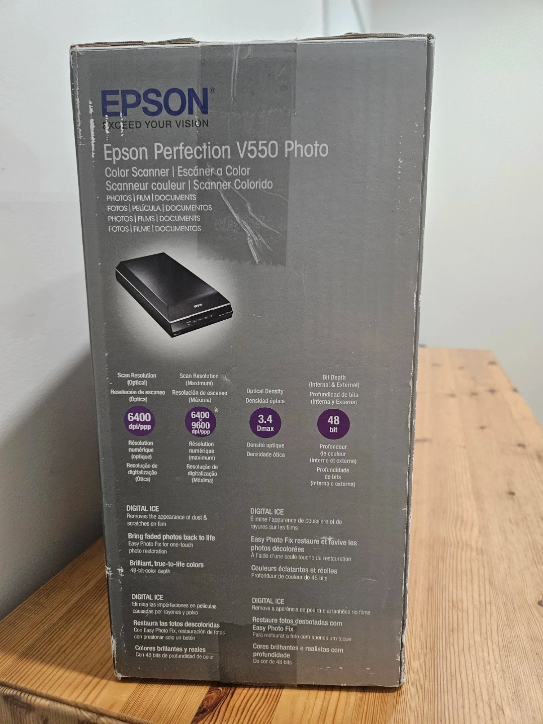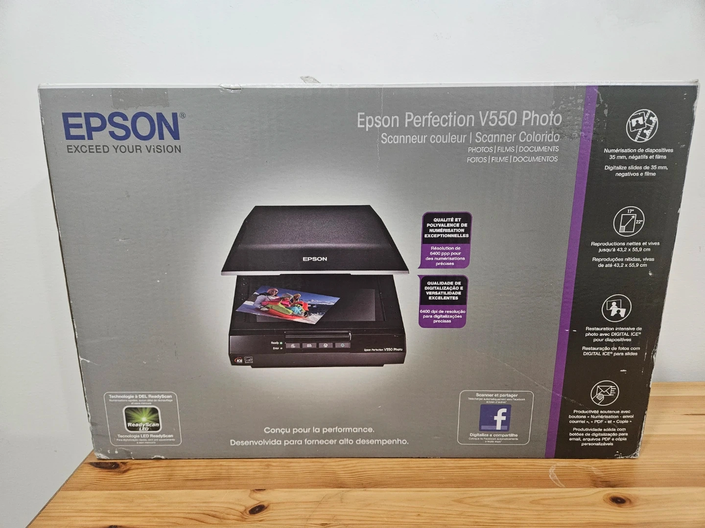 Epson Perfection V550 Photo Color Scanner for photos, film, and documents. Features 6400 dpi optical scan resolution and 48-bit colour depth. Includes digital ICE technology for photo restoration.