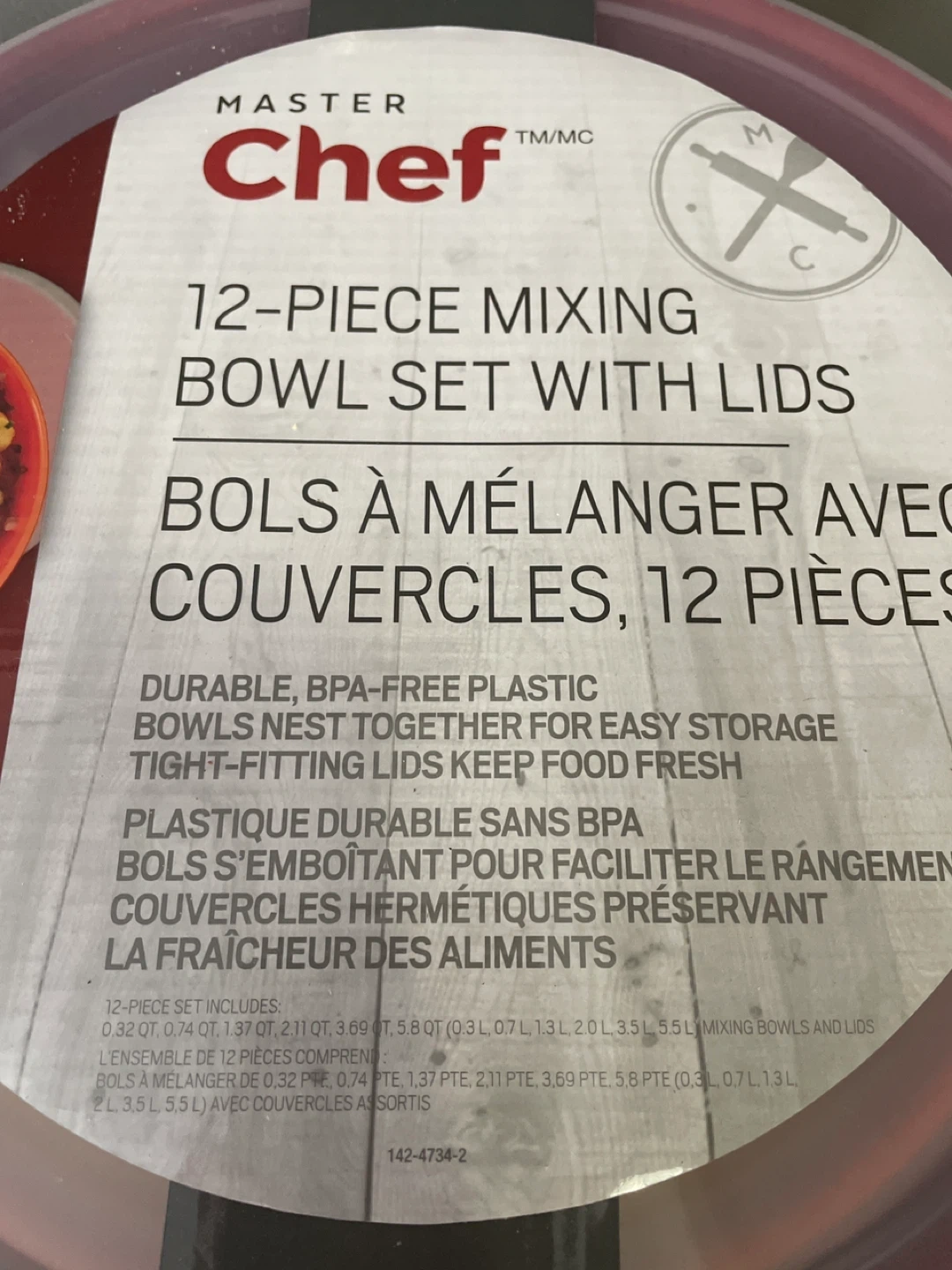 Master Chef 12-piece mixing bowl set with lids. Durable, BPA-free plastic bowls nest together. Tight-fitting lids keep food fresh. Includes bowls in sizes 0.32 Qt to 5.5 L.