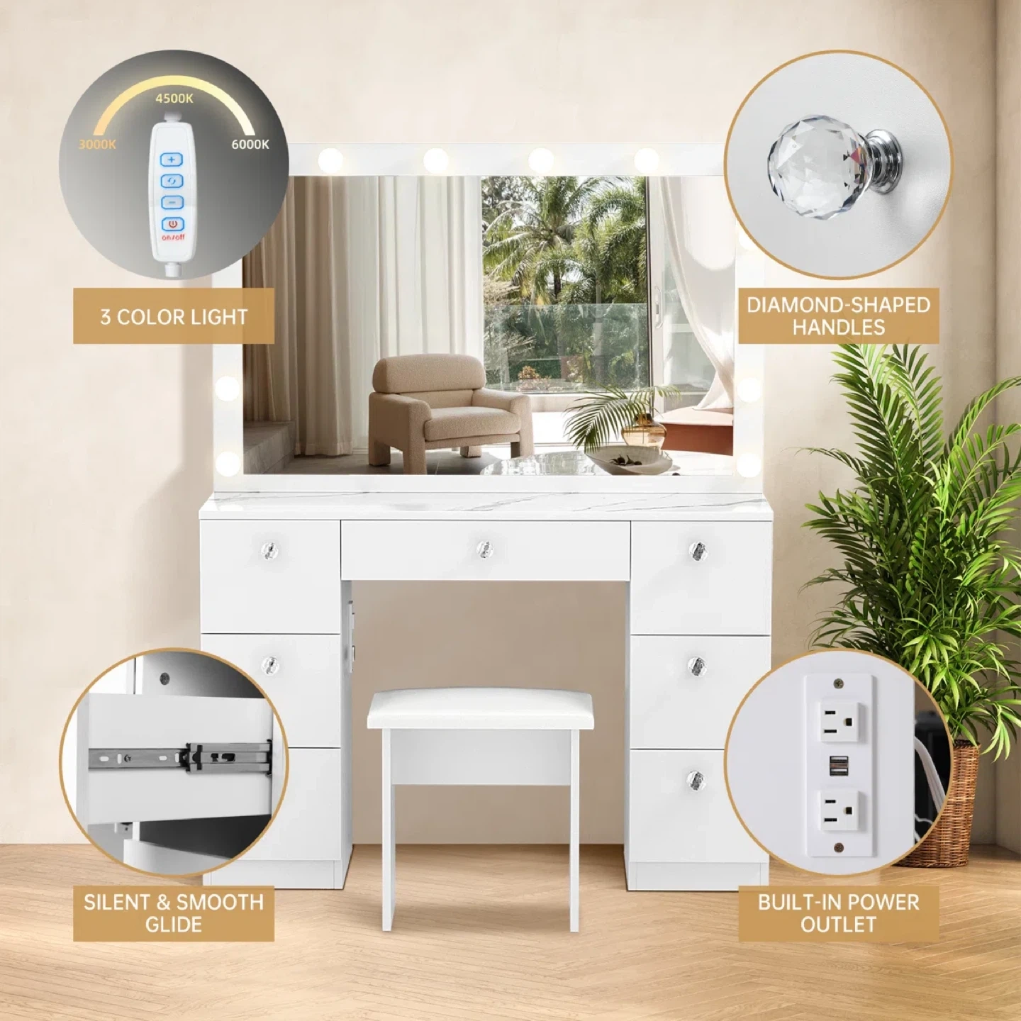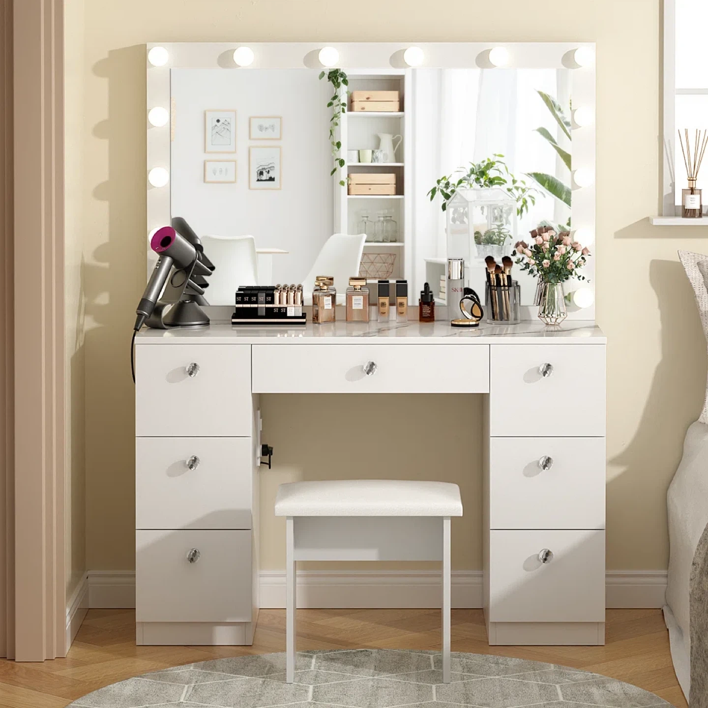 White Vanity Table with Lights and Stool with 7 Storages