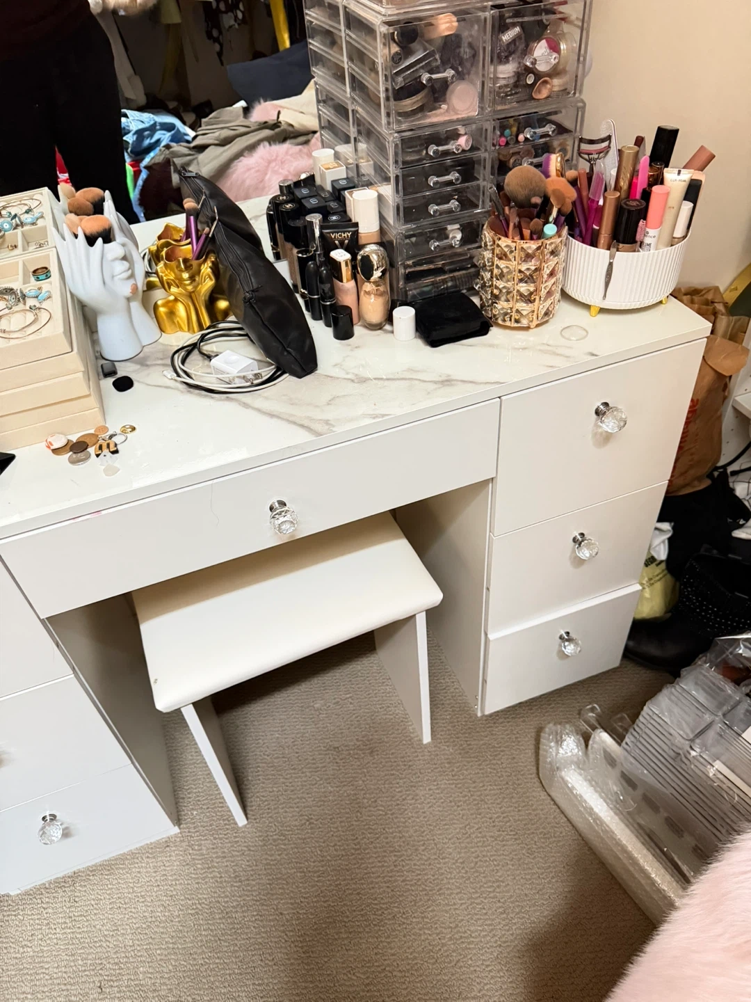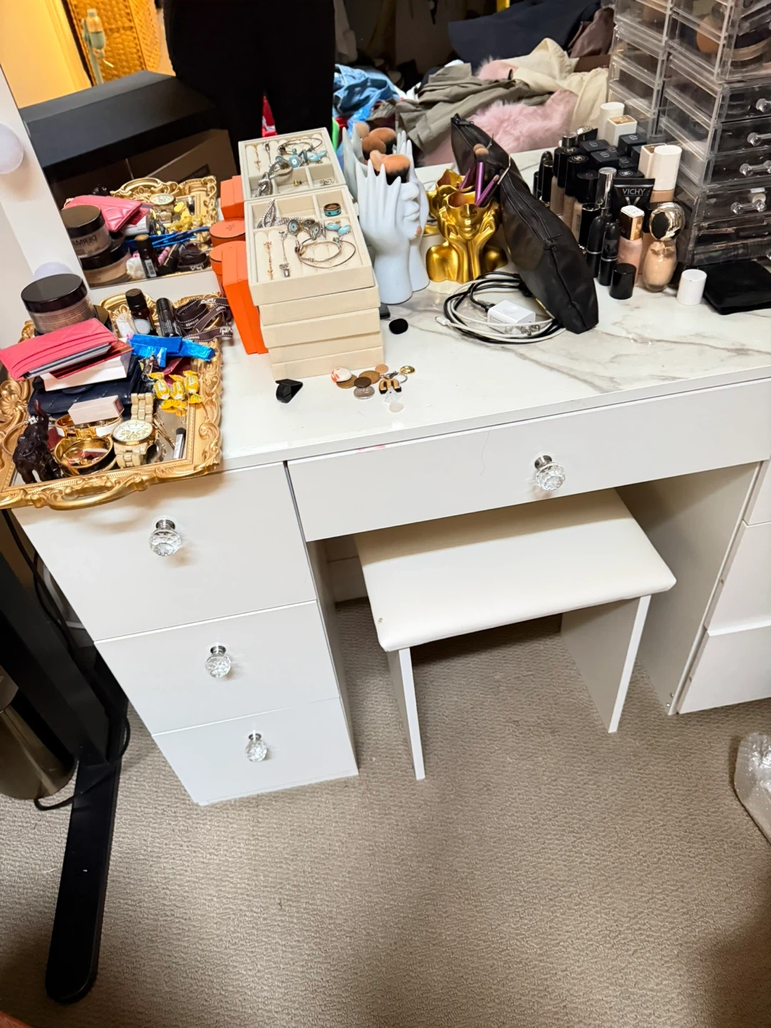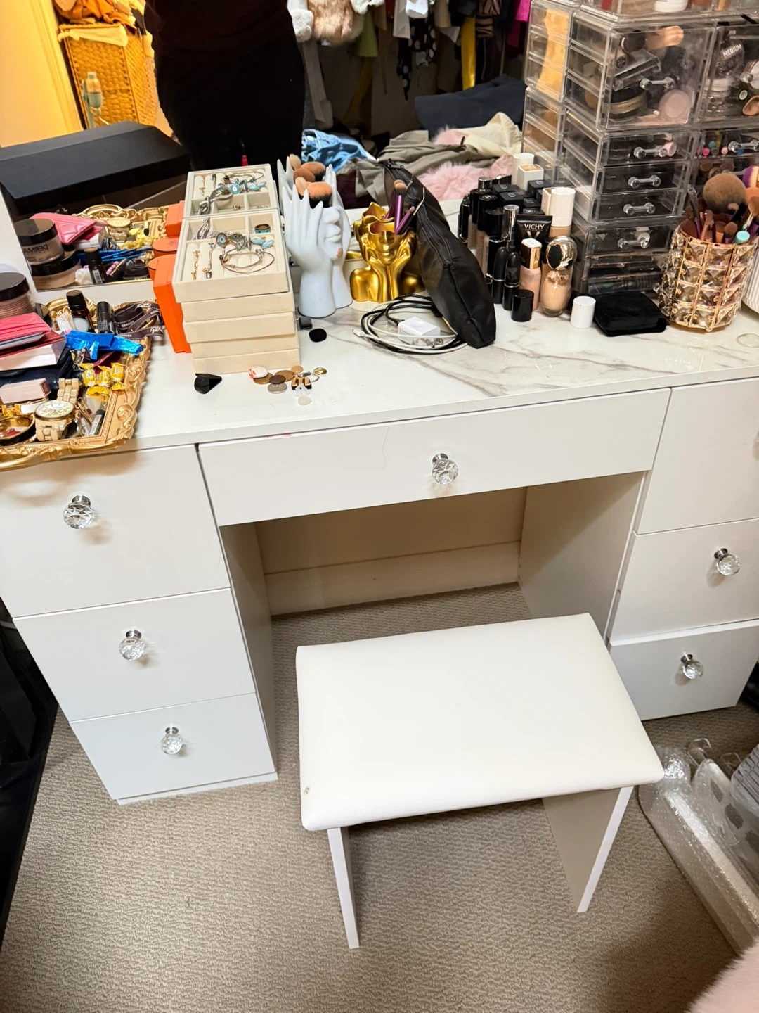 White makeup vanity set with lighted mirror and matching stool. Features 7 drawers for storage. The tabletop has a marble-like finish. Bought at Wayfair.