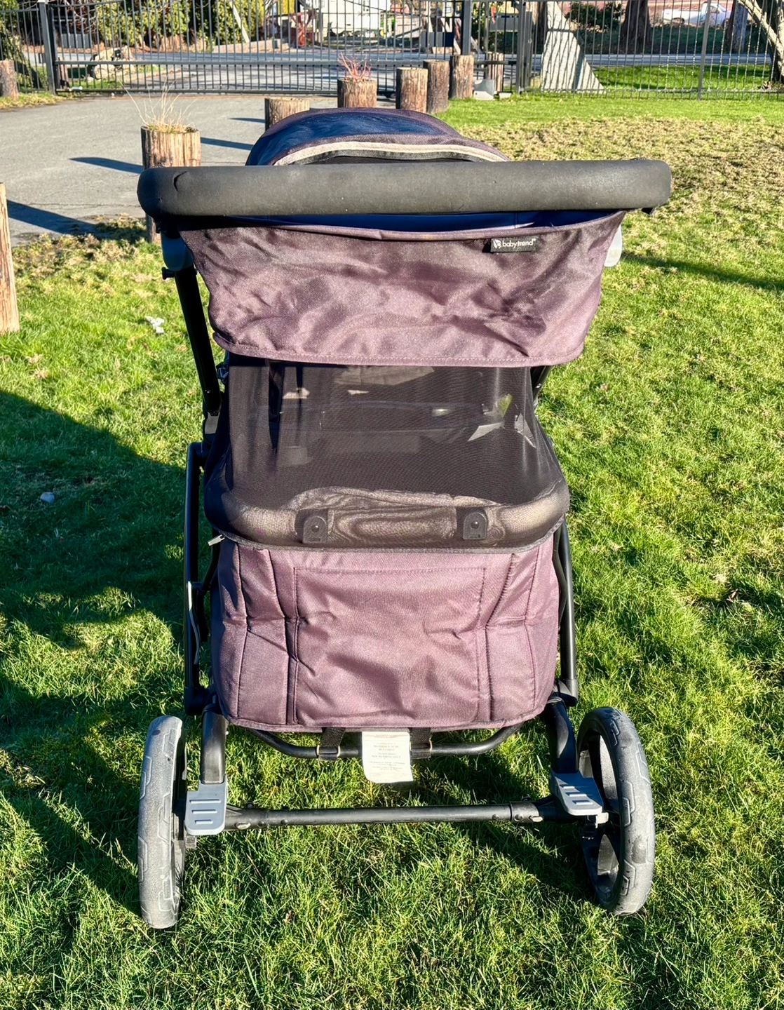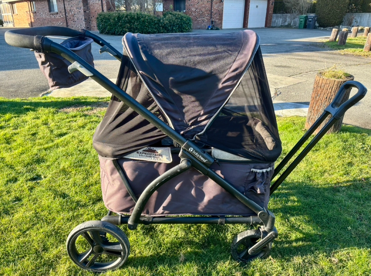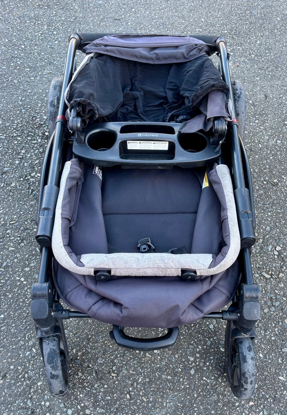Used BabyTrend Expedition 2-in-1 stroller wagon. Features a removable shade, cup holders, and storage pockets. Great for outdoor adventures. Some scratches on the side but otherwise in great condition.