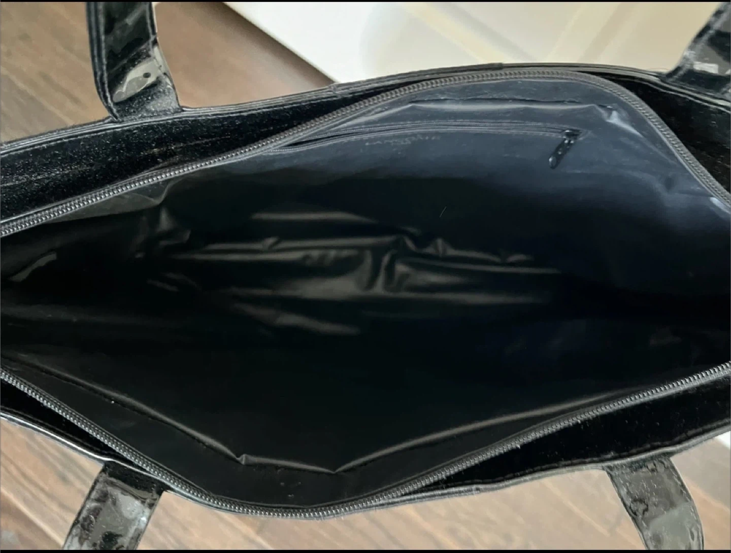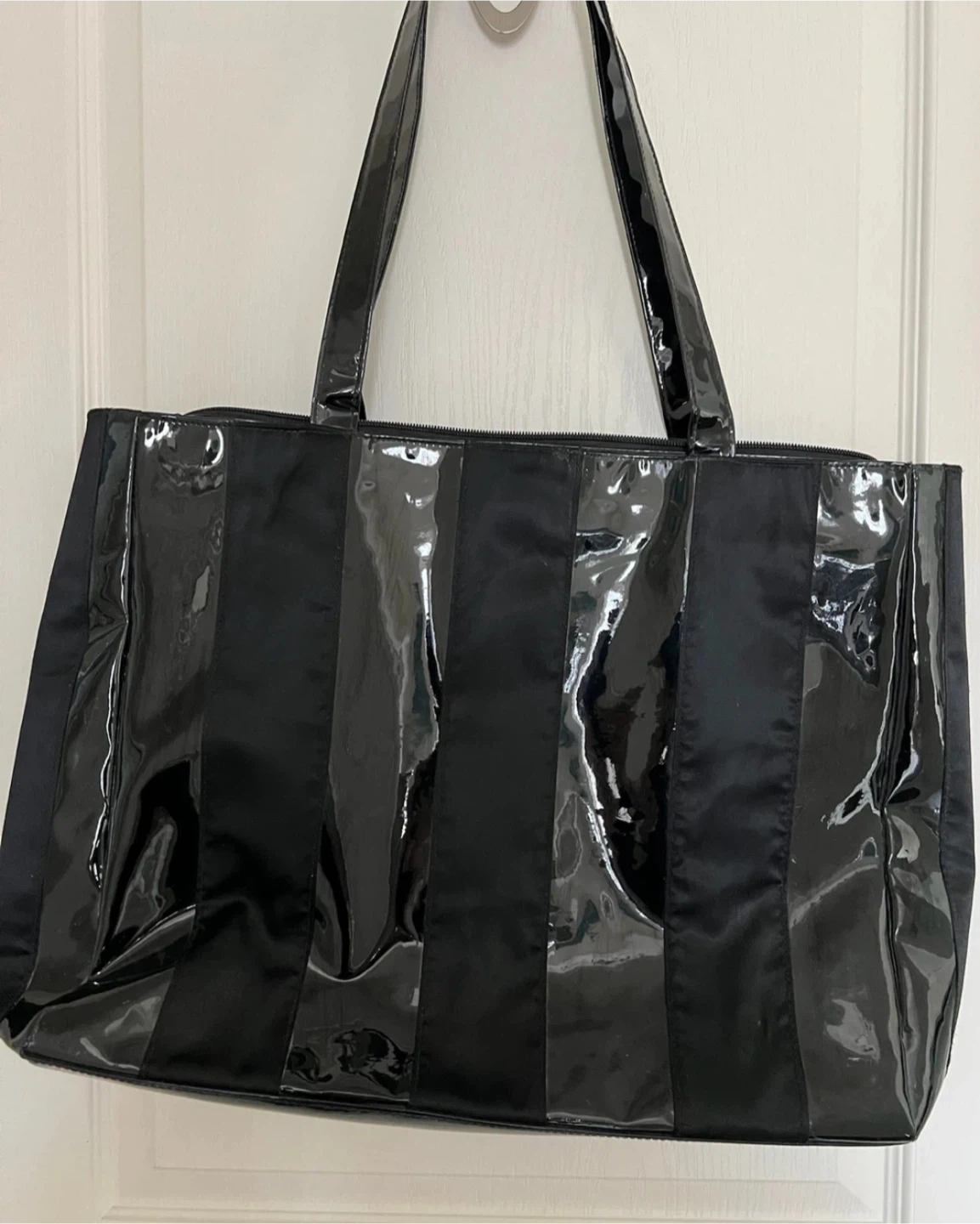 This black tote bag features a sleek design with alternating patent and matte fabric panels. It's spacious and perfect for everyday use or travel. The interior is fully lined with a zippered top closure for security.