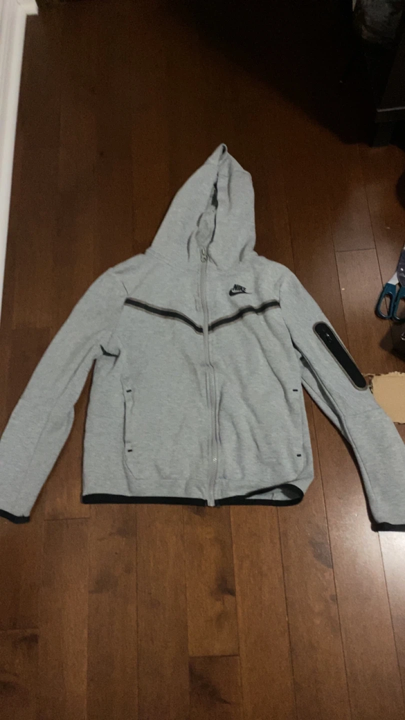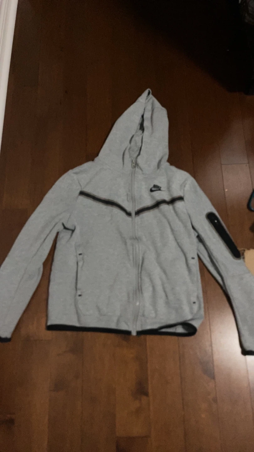 Grey Nike Tech Fleece full zip hoodie. It's a size medium. Features zippered pockets and a comfortable hood. price 70-60 negotiable