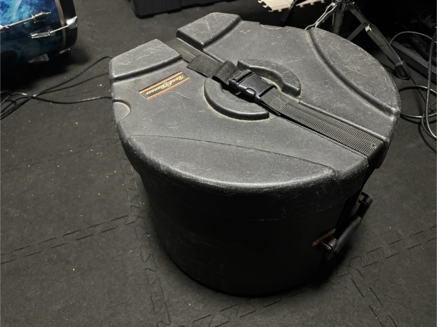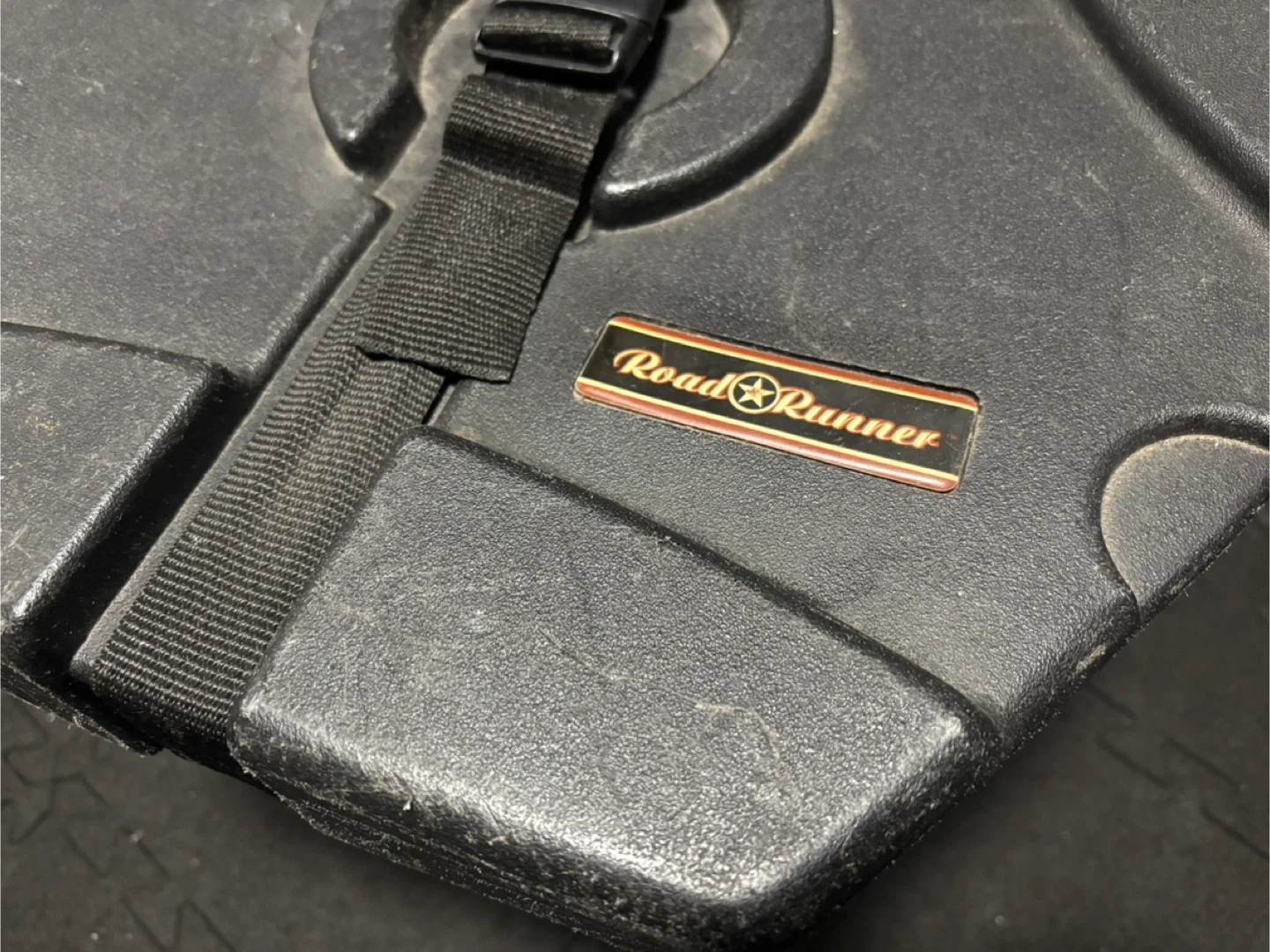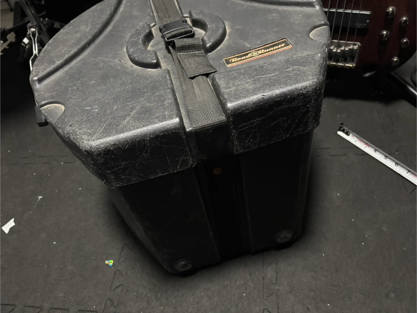 This Road Runner drum gig case offers durable protection for your instrument. It's made of heavy-duty black plastic and includes a strap closure. Inside diameter measures approximately 15 inches.
