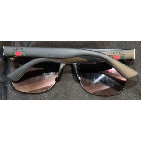 Stylish Gucci Men's or Women's Mirrored Authentic Gucci Sunglasses with black frames & official Gucci symbols. Red and orange mirrored lenses. Comes in original Green Gucci branded case. These glasses also have the "Made in Italy" stamp, the Official "Gucci" Stamp, along with the Serial number on the inside of the right arm of the Sun glasses.