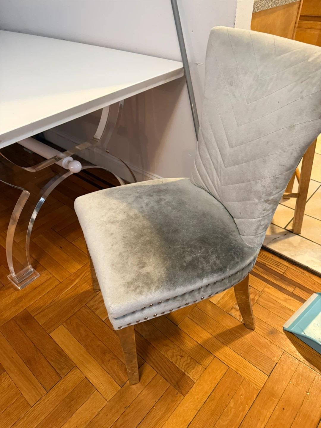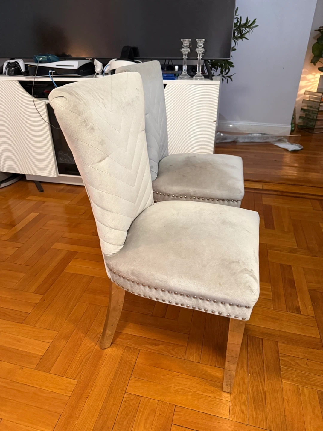 • Two chairs have light stains / slight dirt on the seat cushions (shown in photos)