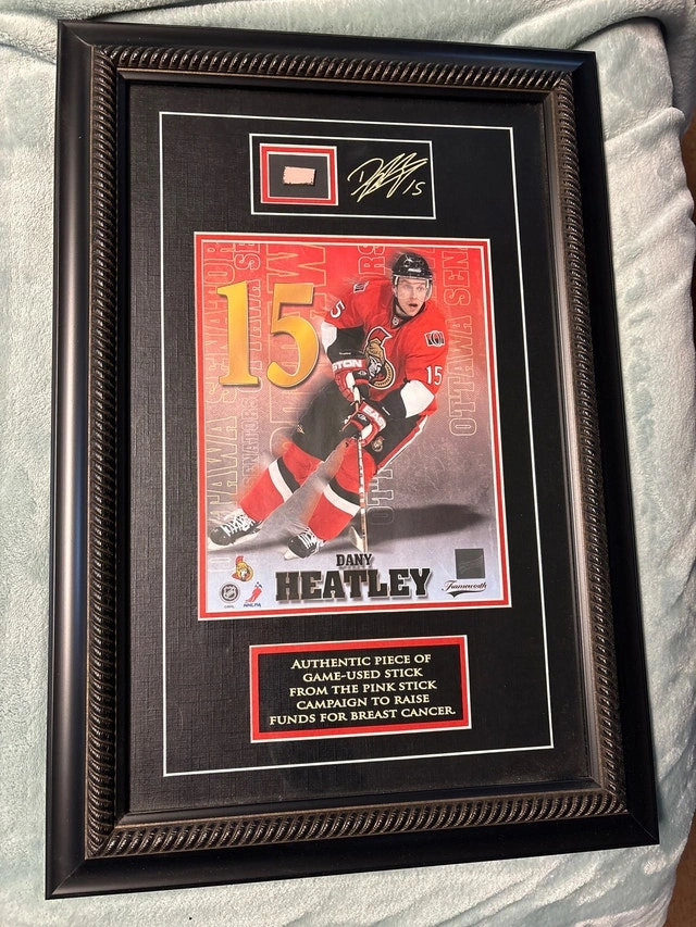 This framed memorabilia features Dany Heatley, #15, of the Ottawa Senators, including a piece of game-used stick from the Pink Stick Campaign to raise funds for breast cancer. It also includes a certificate of authenticity. This item is in great condition and would be the perfect addition to any hockey fan's collection. Player: Dany Heatley, Team: Ottawa Senators, Piece of game-used stick included, Pink Stick Campaign for Breast Cancer Awareness, Framed and ready to hang, Certificate of Authenticity. Condition: Used - Like new. Payment: Cashless payment, Cash accepted.