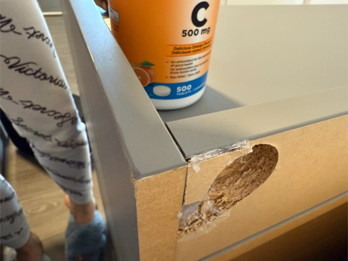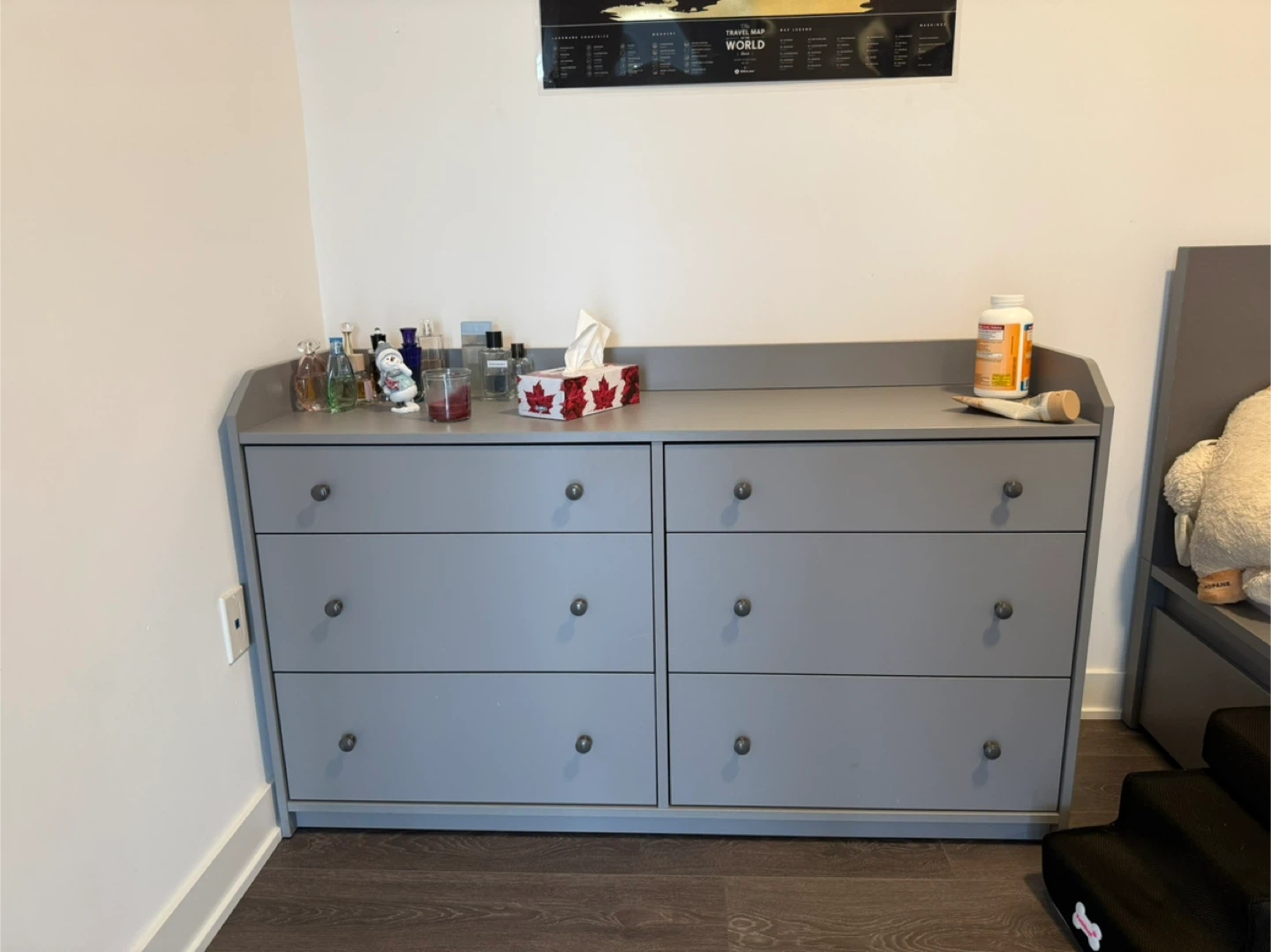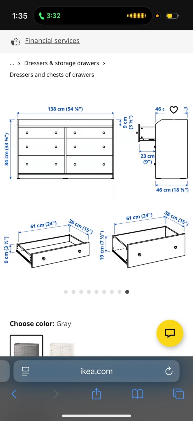 This is a gray IKEA HEMNES 6-drawer dresser. It's 138 cm wide and 84 cm tall. Some minor scuffs are visible on the drawer fronts.