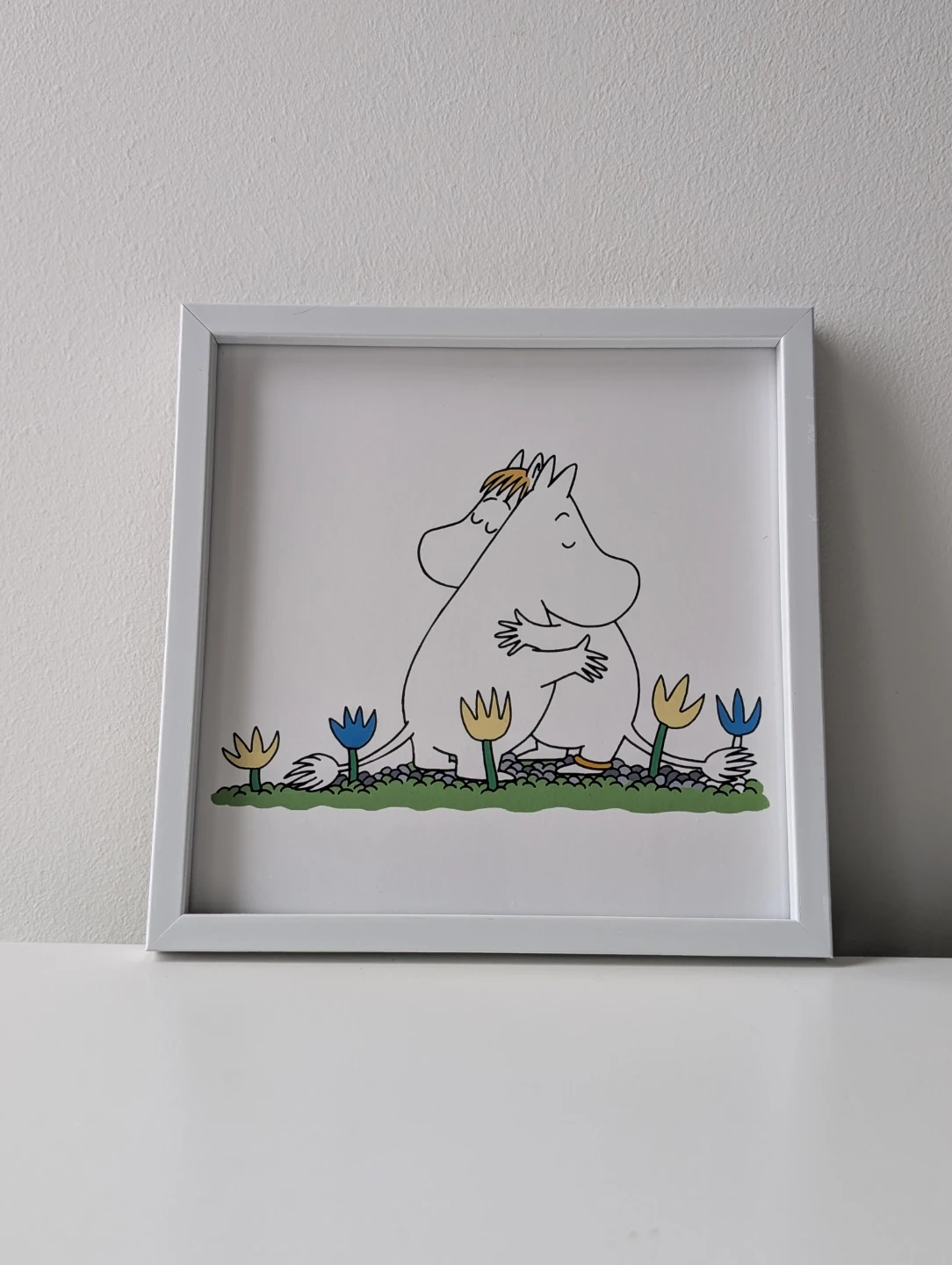 Sweet Moomin characters hugging in a garden. Features Moomintroll and Snorkmaiden art. White frame included.