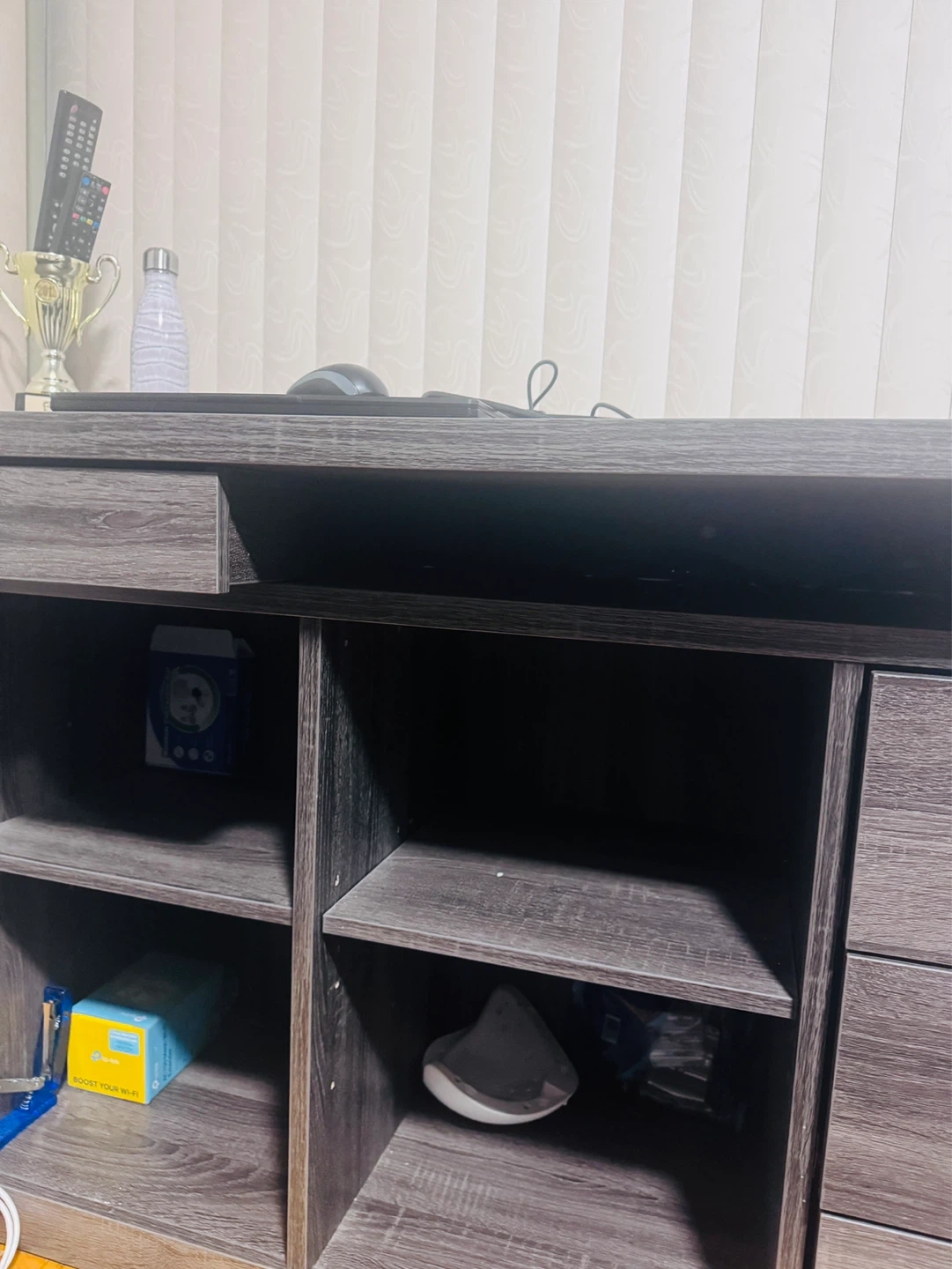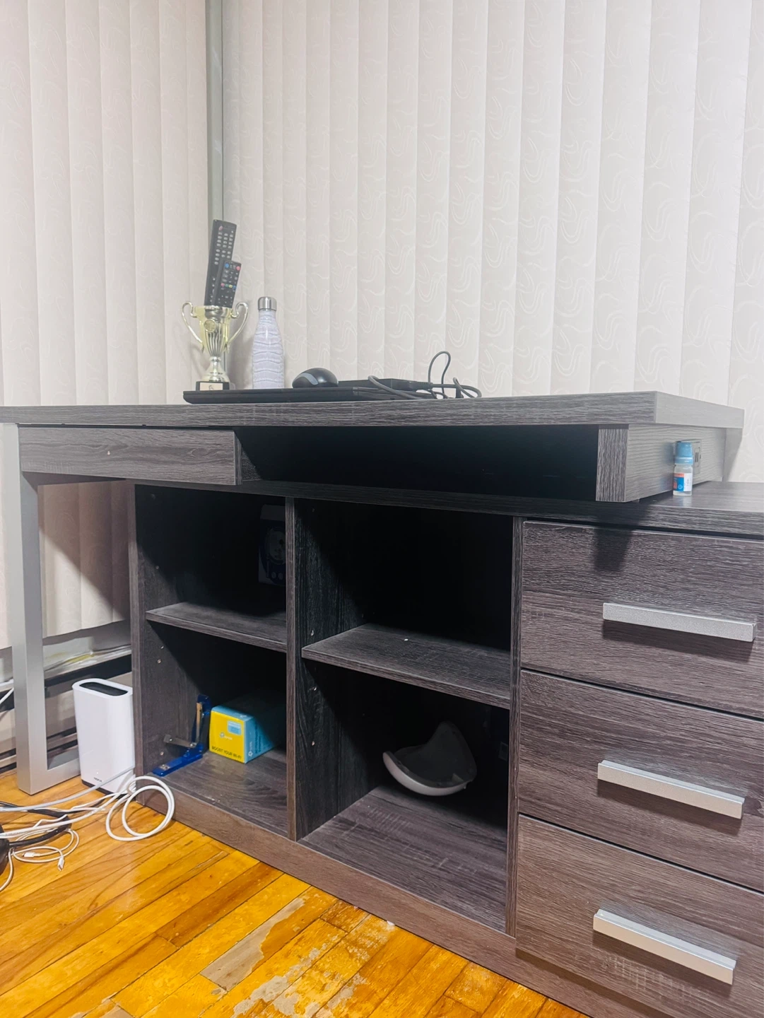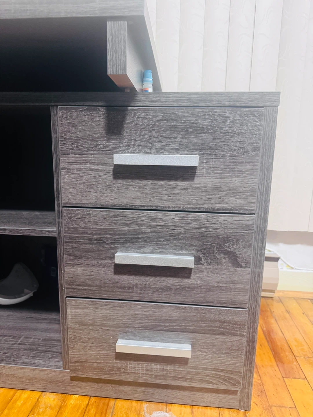 This computer desk features a dark grey wood finish with three drawers and open shelving. It's a sturdy desk with a built-in hutch. Perfect for organizing your workspace!