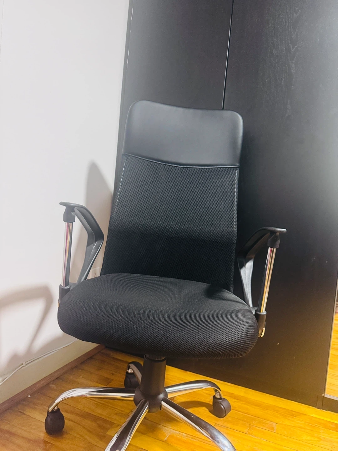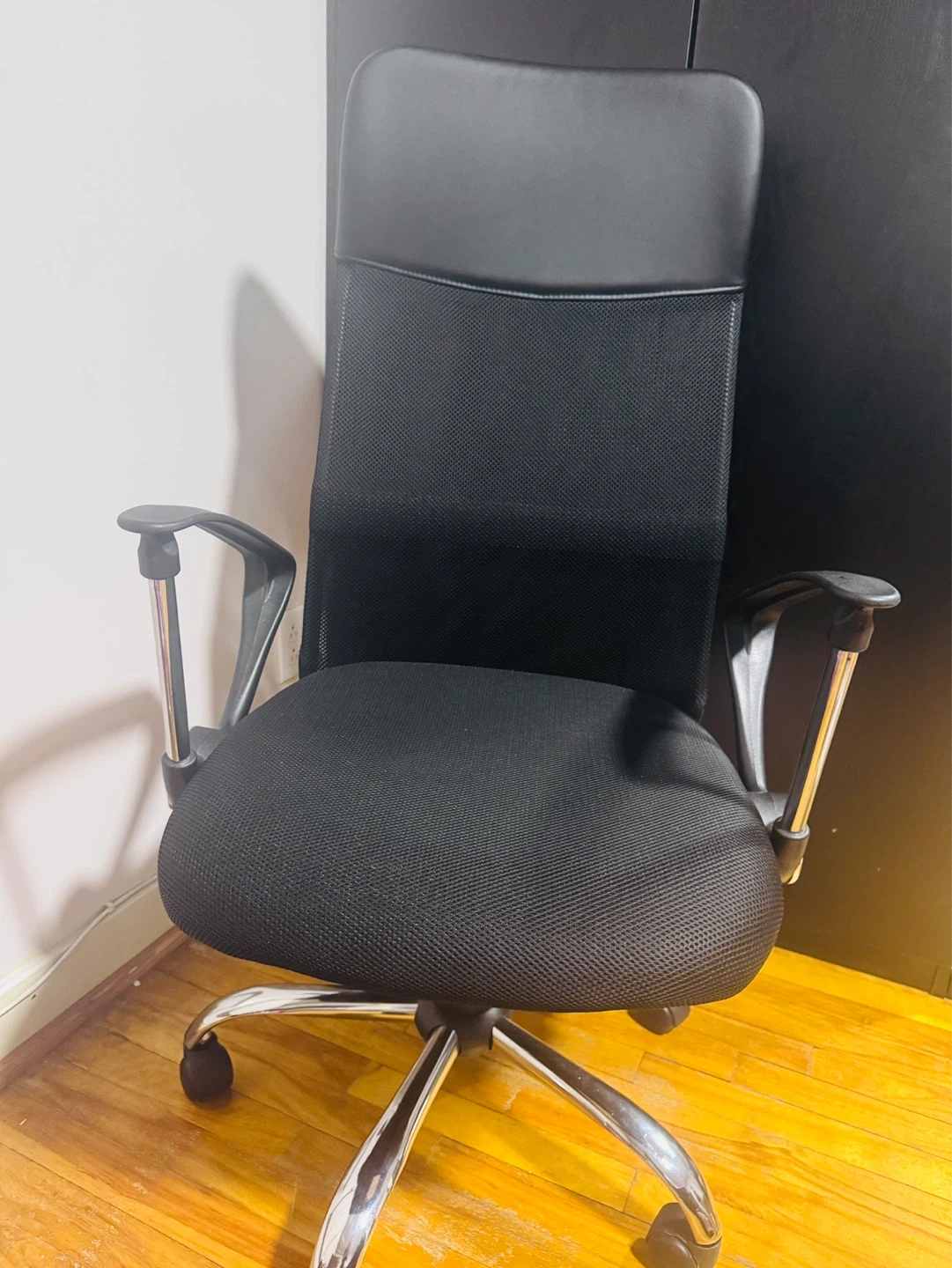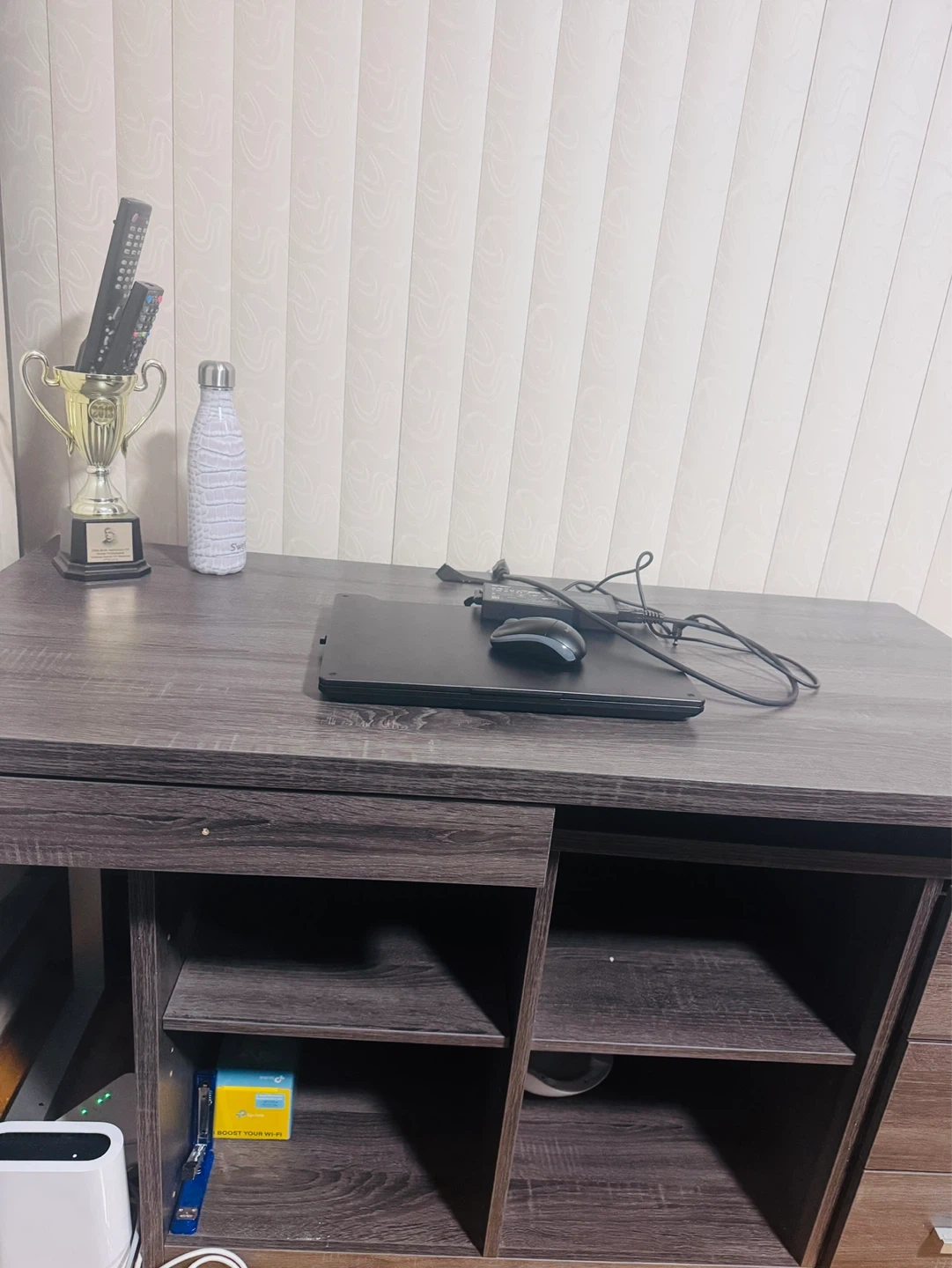 This computer desk features a dark grey wood finish with three drawers and open shelving. It's a sturdy desk with a built-in hutch. Perfect for organizing your workspace!