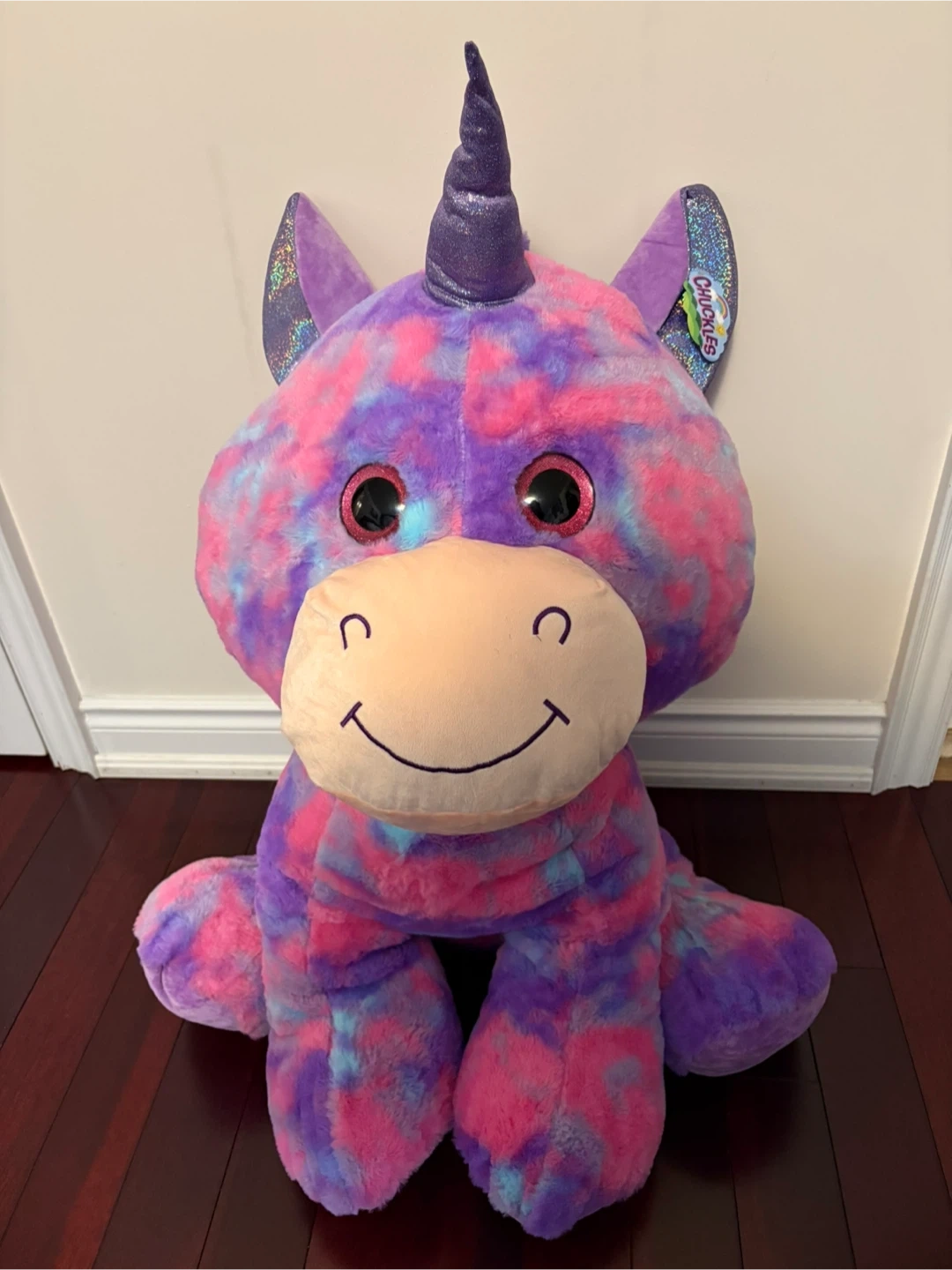 This is a super cute, large Chuckles plush unicorn with a tie-dye pattern of purple, pink, and blue. It has big, sparkly eyes and a friendly smile. It's a cuddly and colourful stuffed animal that's sure to bring a smile!