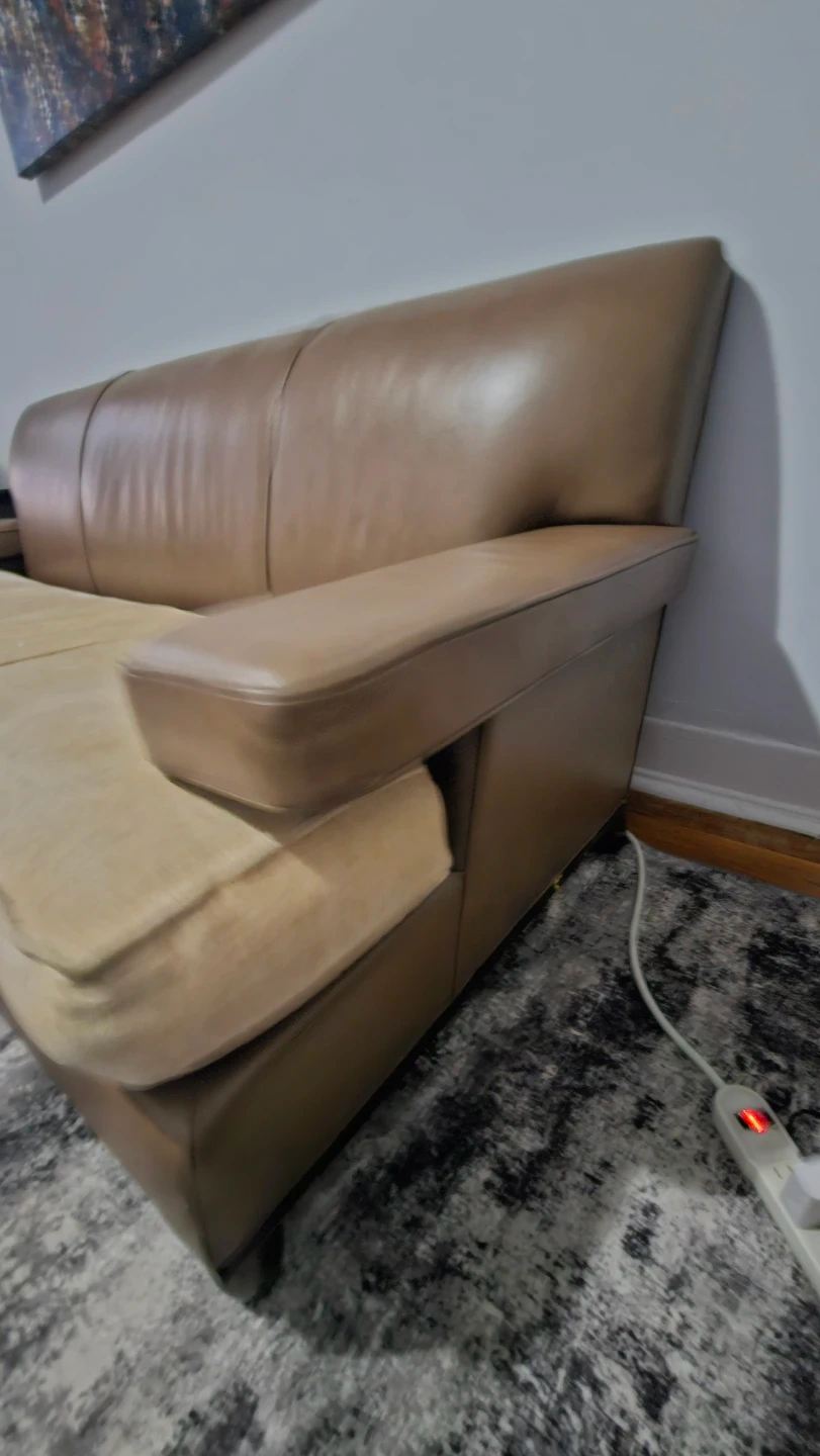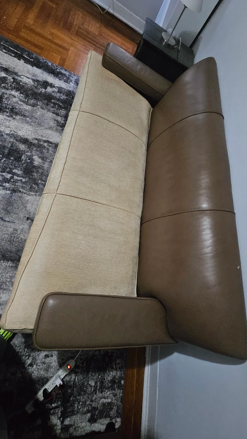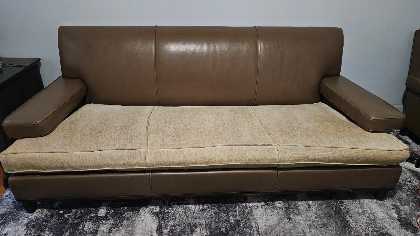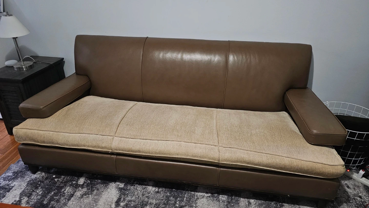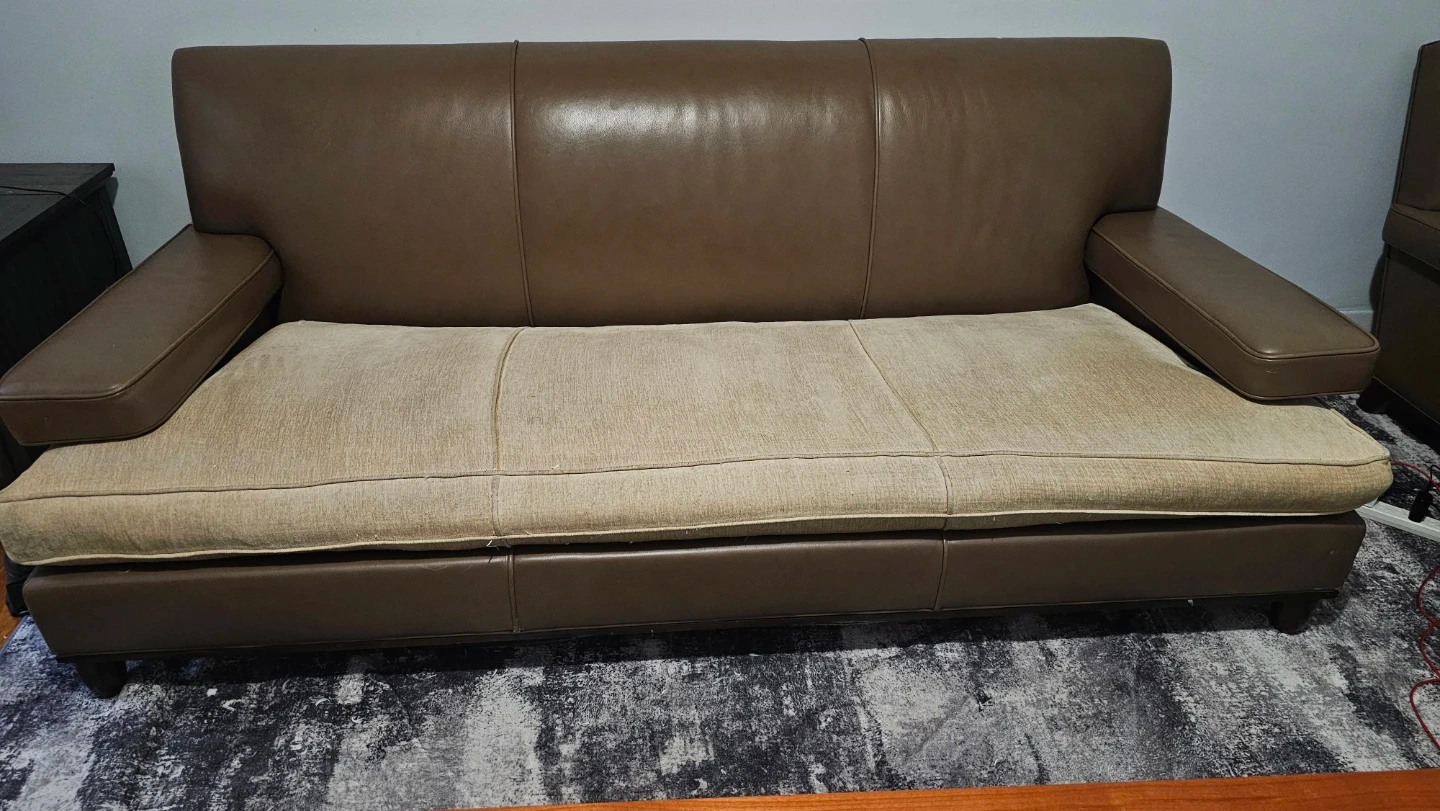 Brown Leather Sofa with Tan Fabric Cushions