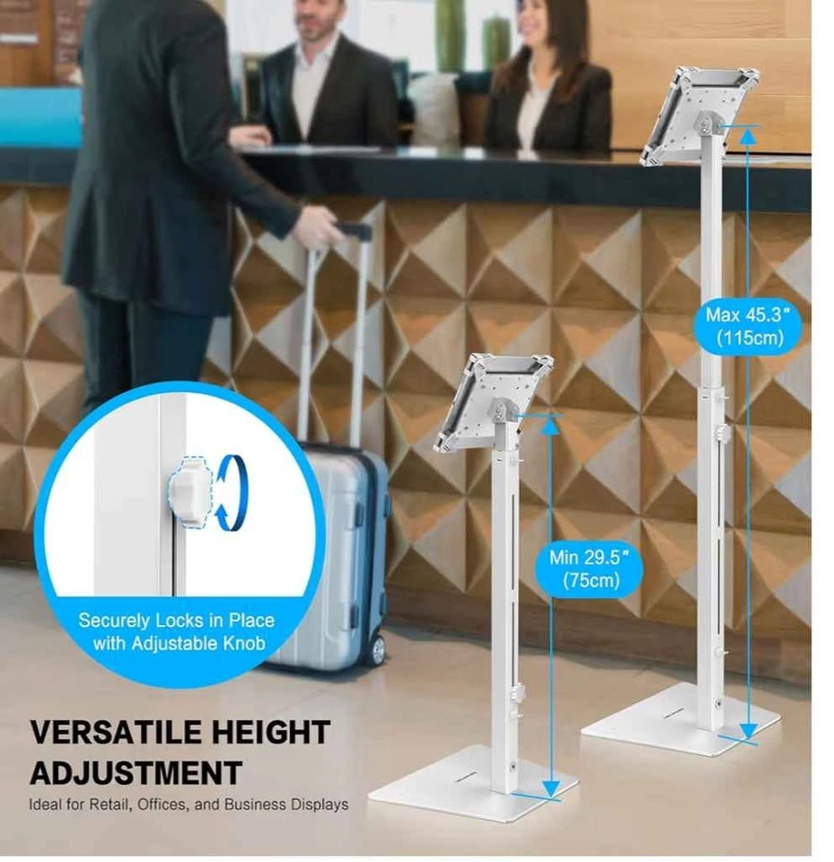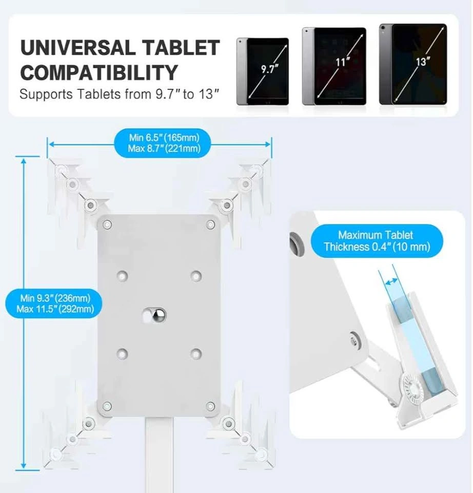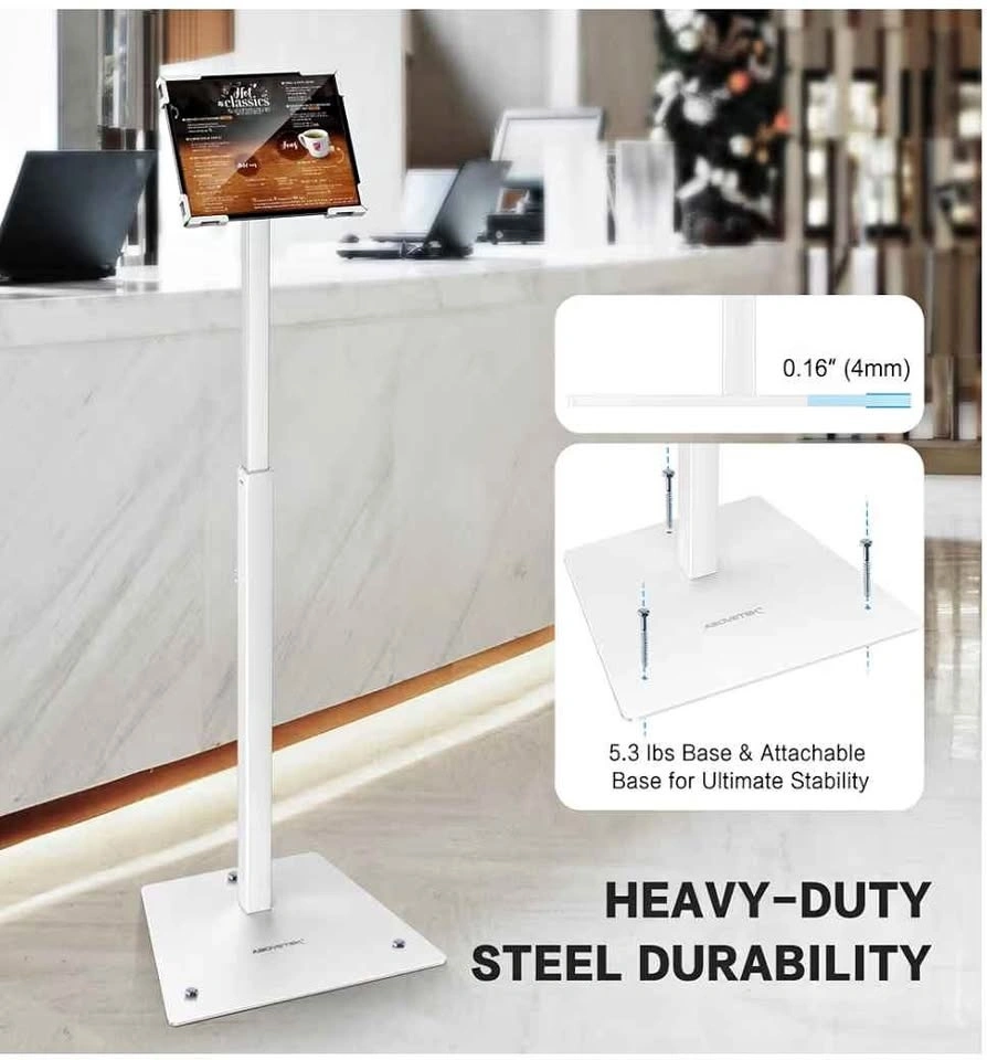 Sturdy ABOVETEC tablet floor stand in white. Heavy-duty steel build with adjustable height from 29.5" to 45.3". Fits tablets 9.7" to 13" and up to 0.4" thick. Features a stable 5.3 lbs base and locks securely with an adjustable knob.
