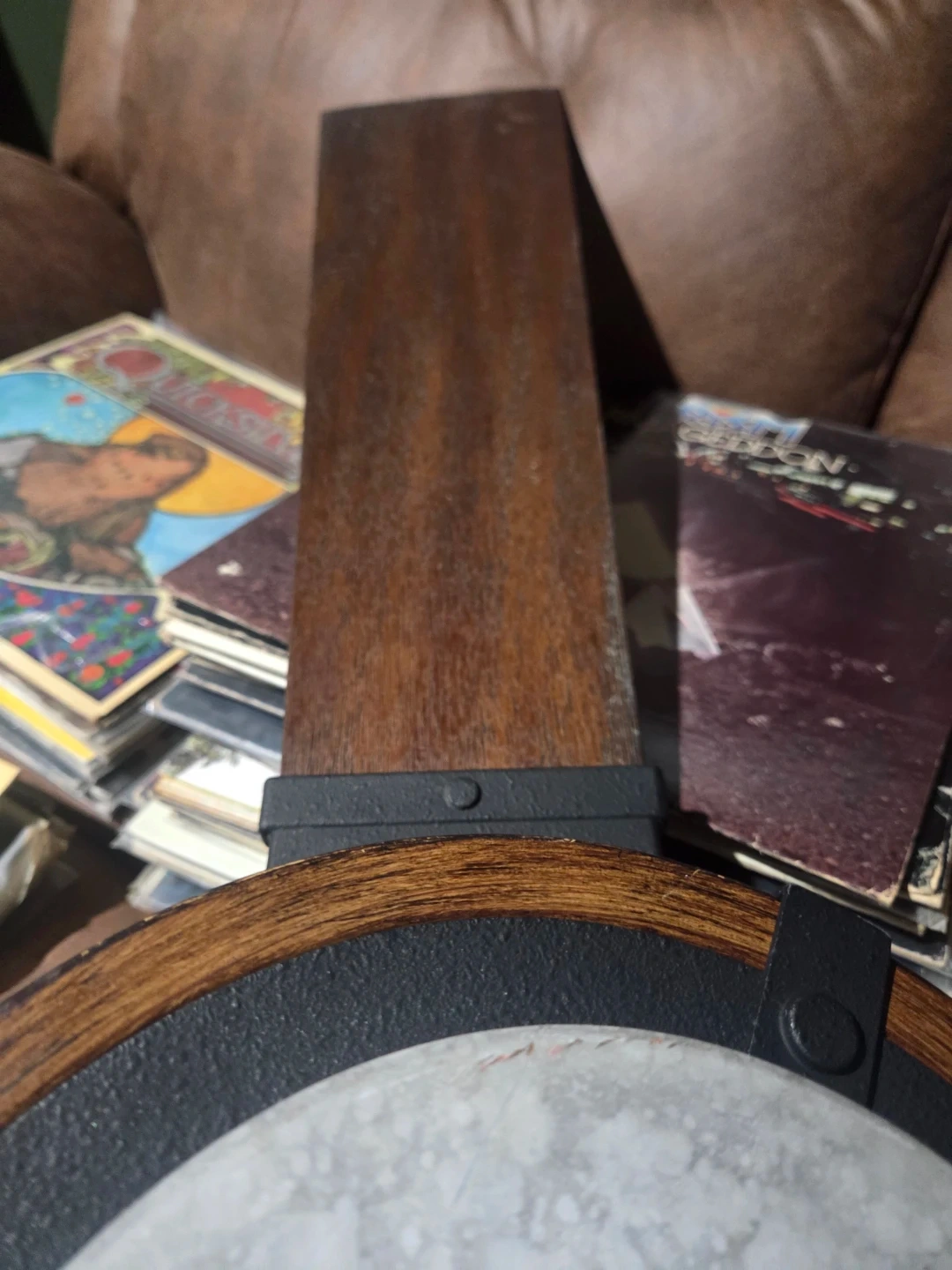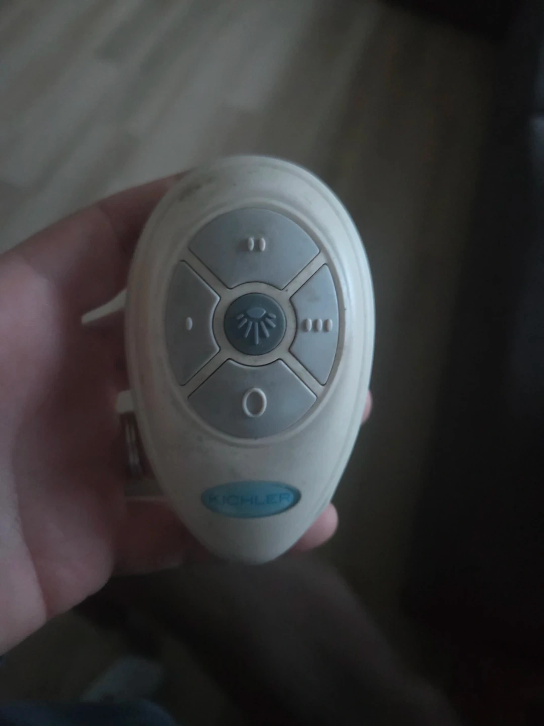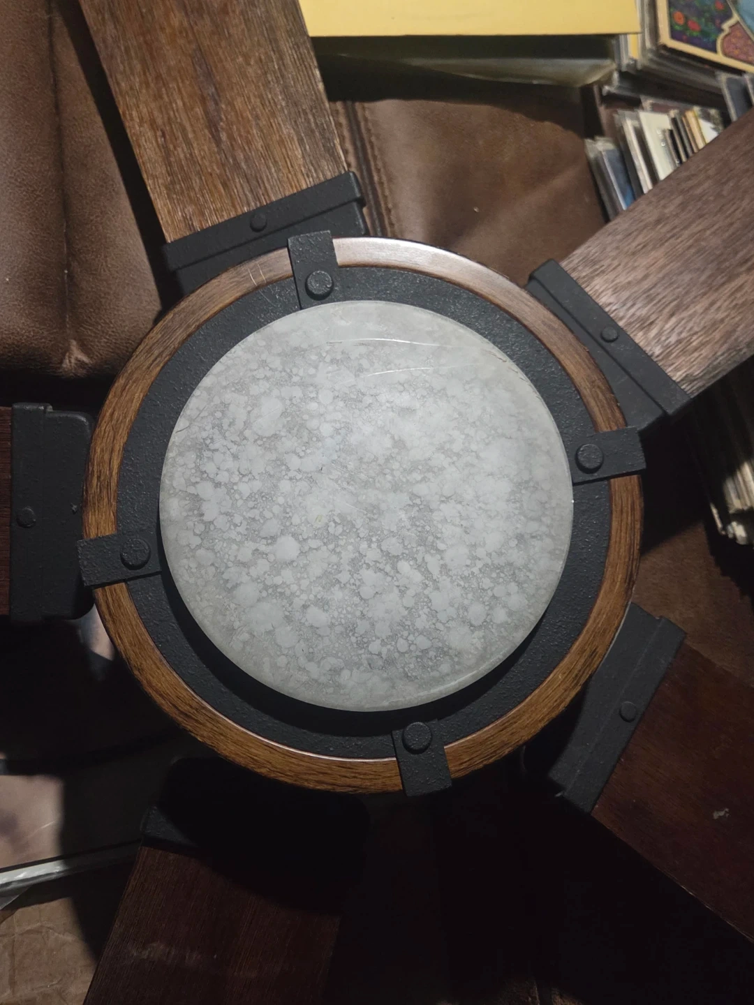 This is a wooden blade ceiling fan with a central light fixture. The blades have a dark wood finish and are approximately 21.5 inches long from the center. Comes with remote.