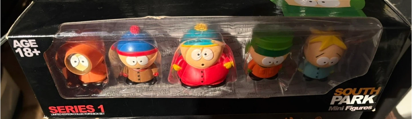This is the South Park Series 1 Limited Edition Collector's Box Set. It includes five mini figures from the popular animated show. Figures are for ages 18+.