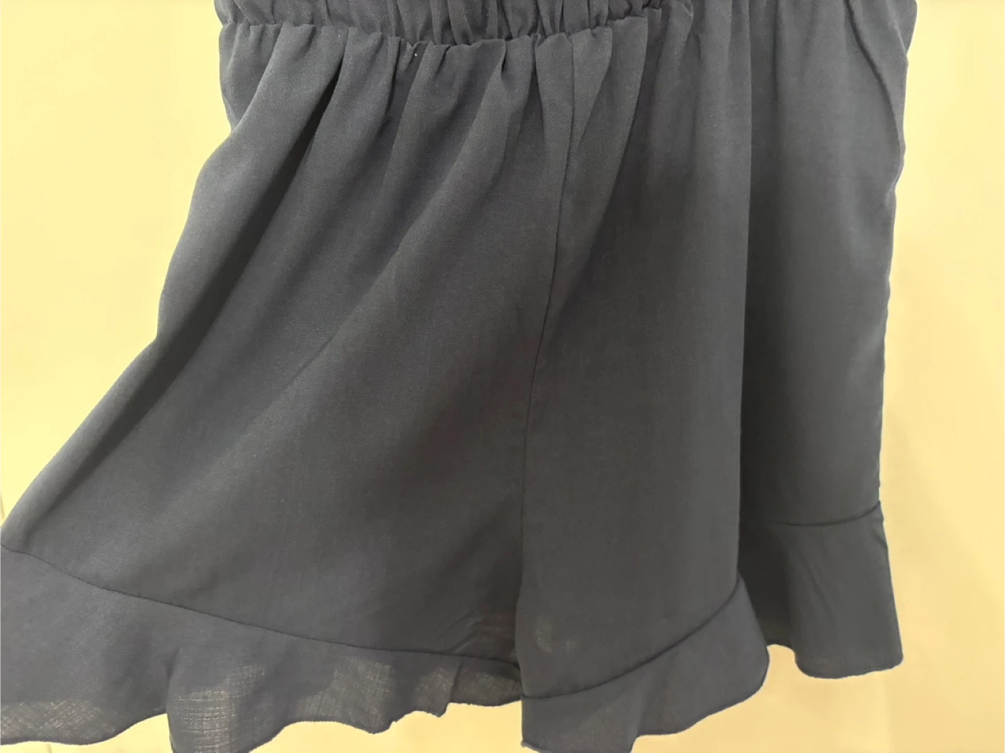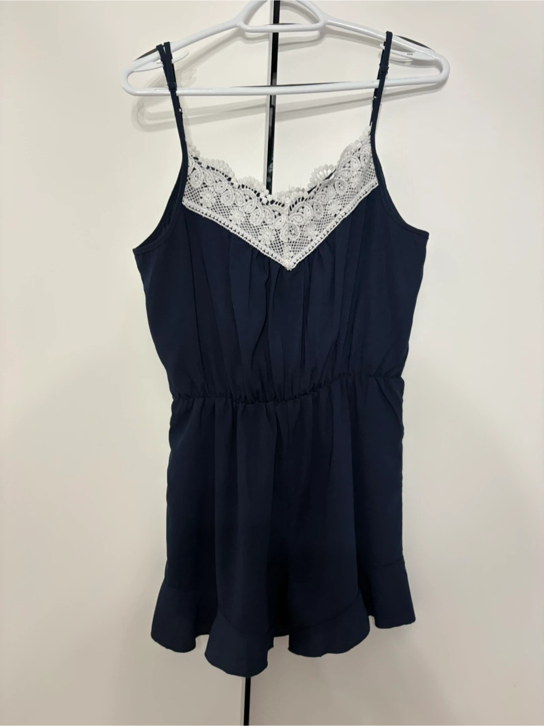 Cute navy blue romper with adjustable straps! It's perfect for summer or wearing around the house. It's in great condition and ready for a new home. Worn twice and selling because it no longer fits. No size tag but purchased a small.