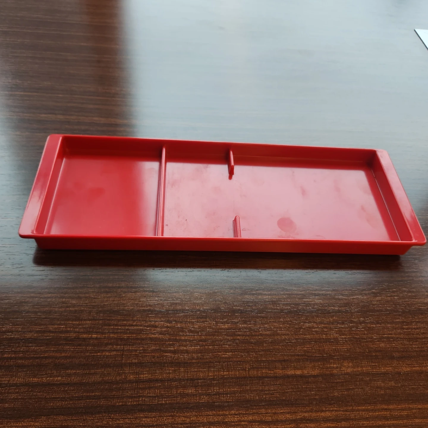 Here's a red melamine tray by Teknion. It's in great shape and ready for a new home! You can use it for soaps/items by your sink or dishwasher!