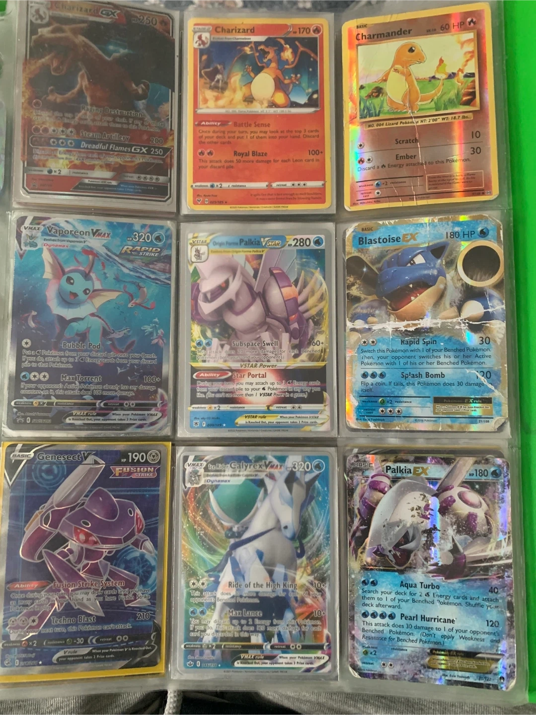 Collection of various Pokémon trading cards. Includes Pokémon like Alakazam, Golem, Charizard, Blastoise, Palkia, and more. Cards are from different sets and generations.