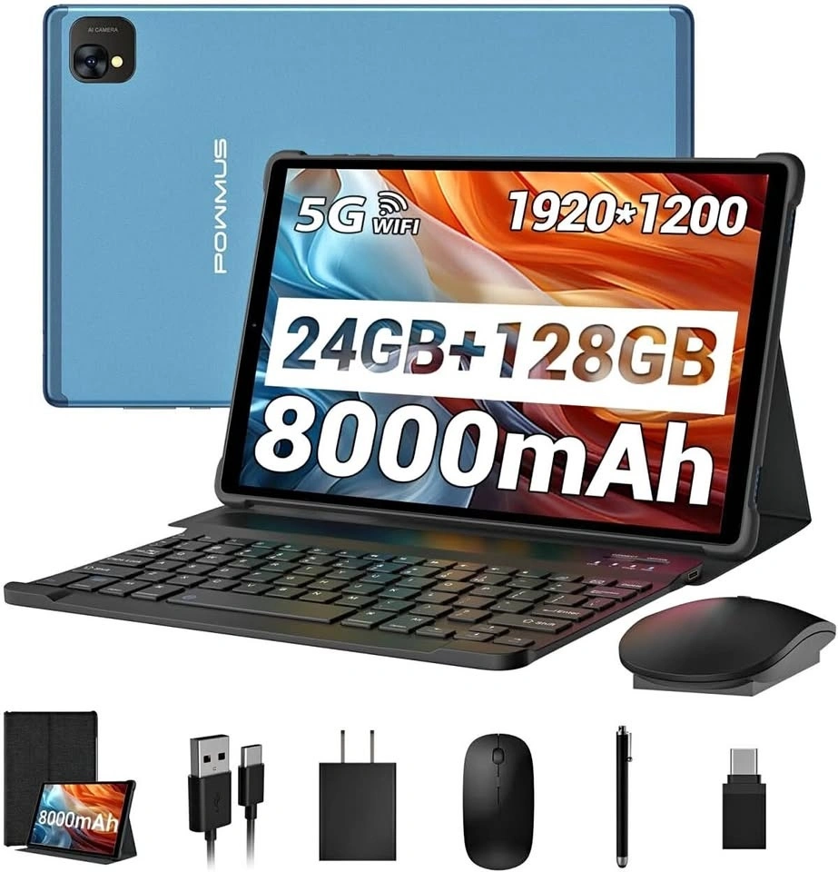 POWMUS Android Tablet 10.1 Inch Tablets, 1920 * 1200 IPS LCD Screen, 24 GB RAM,128GB Storage Expand 1TB, 2.0GHz CPU,8000mAh, 5GWiFi,8+13MP, BT5.0, GPS Tablette PC w Keyboard and Mouse - Blue