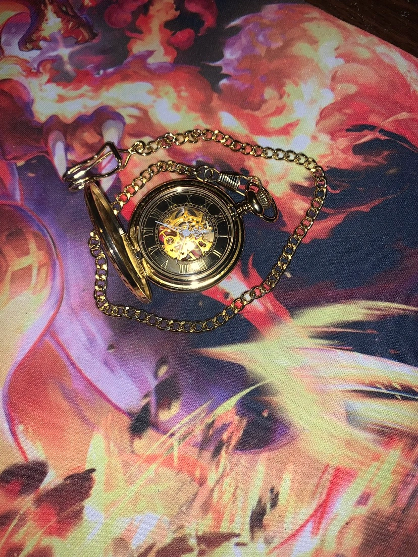 This never used, gold plated, kinetic-powered Swiss movement, sapphire-jewelled skeleton pocket watch is a perfect modern take on a timeless classic! It features a hook chain and can be engraved on the front or inside the push button-opened face!