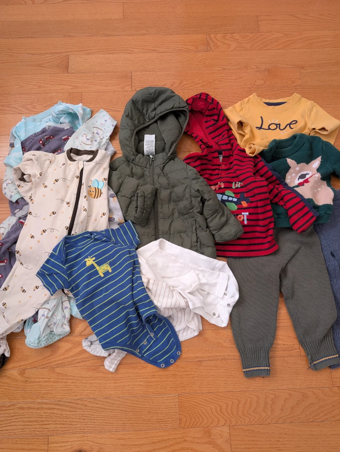 A bundle of boys' toddler clothes including sweaters, hoodies, and bodysuits. Features various fun designs like a deer, airplane, and Mickey Mouse. Some items are from Carter's. Selling as a bundle.
