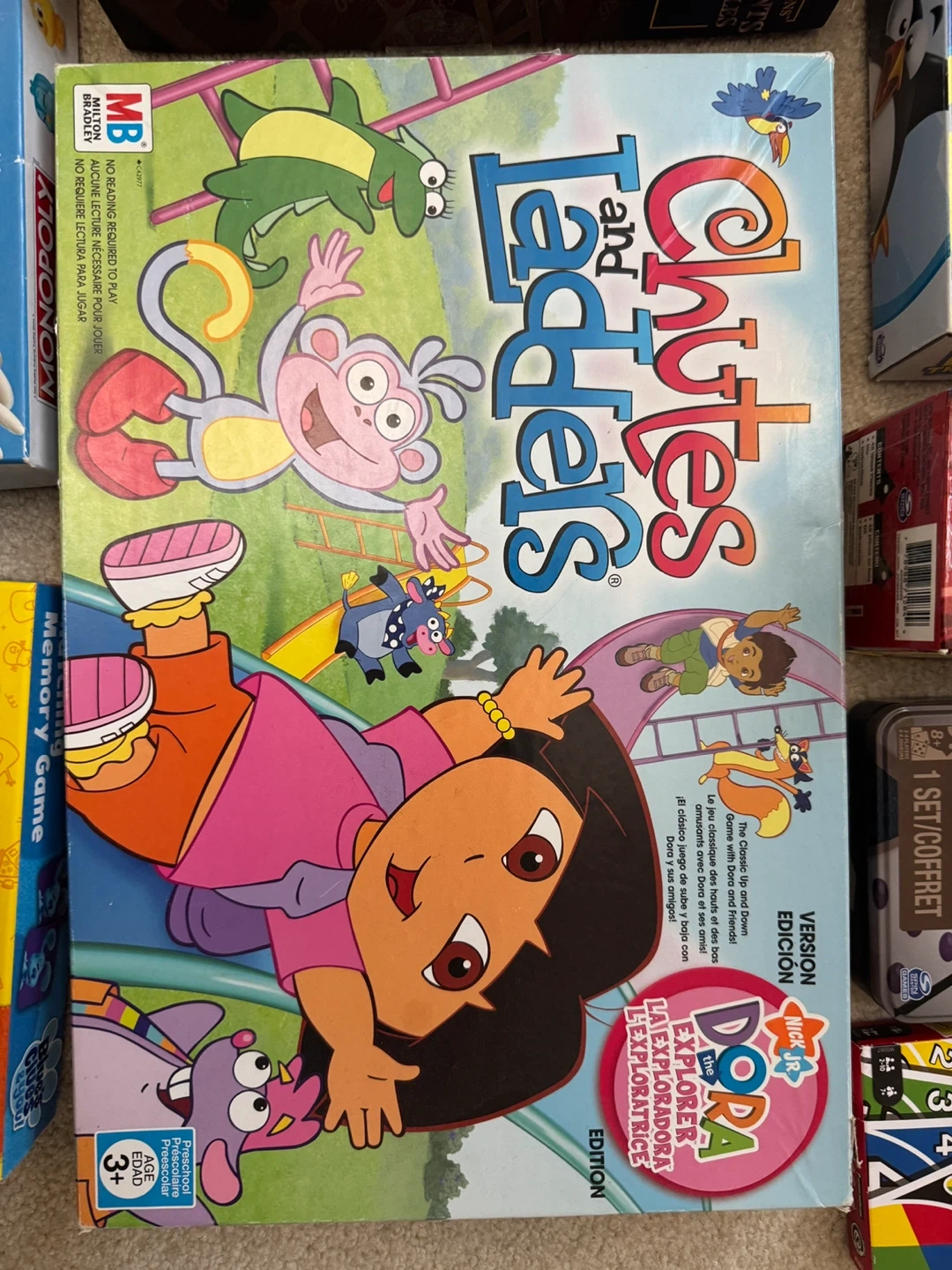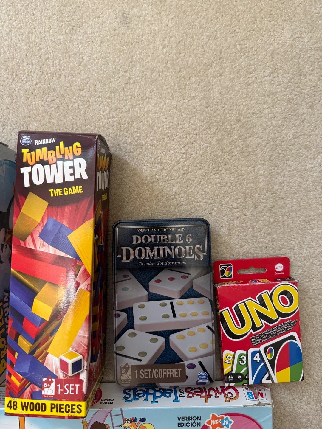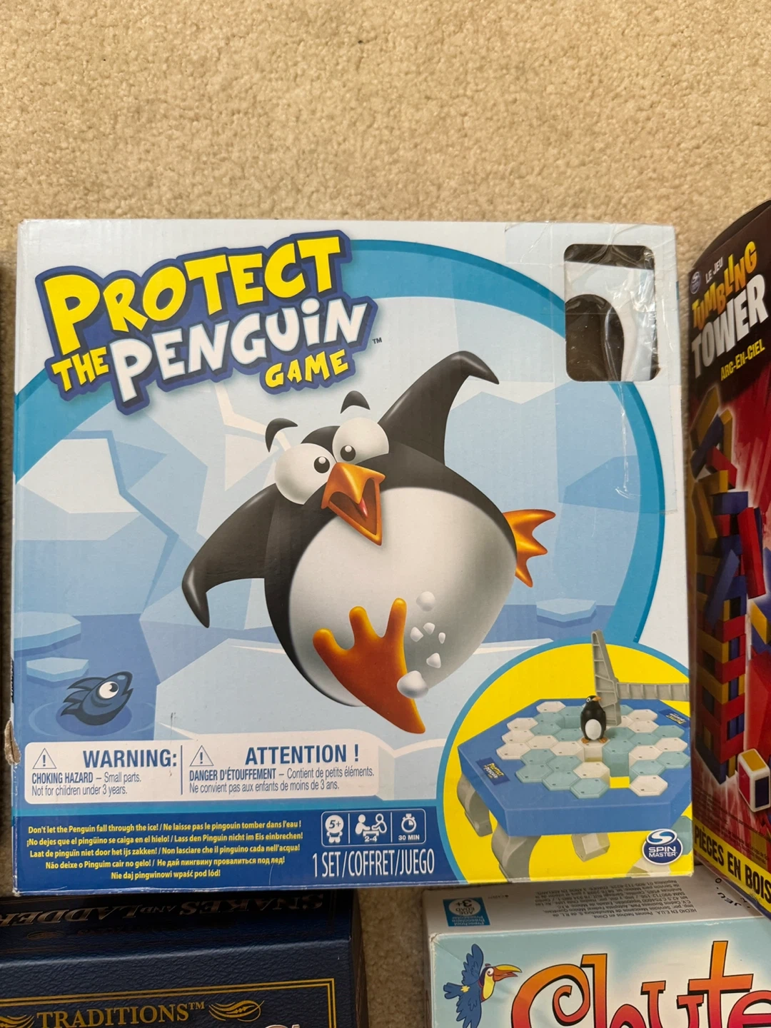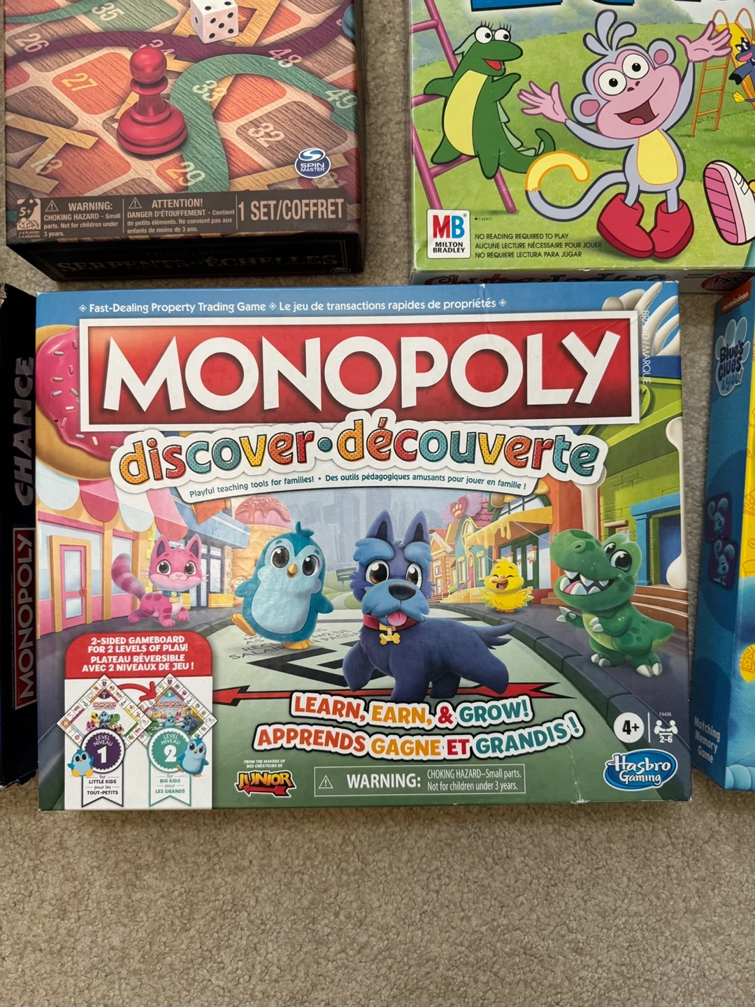 Selling a variety of board games, perfect for family fun! Includes classics like Monopoly Discover, Chutes and Ladders, Snakes and Ladders, Sink N' Sand, Protect the Penguin, Deluxe Loteria, Tumble Tower, Double Dominoes, Uno and Blue's Clues Matching Memory Game. All games are in good condition and ready for a new home!