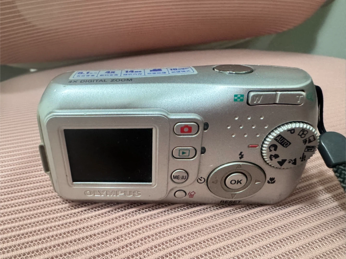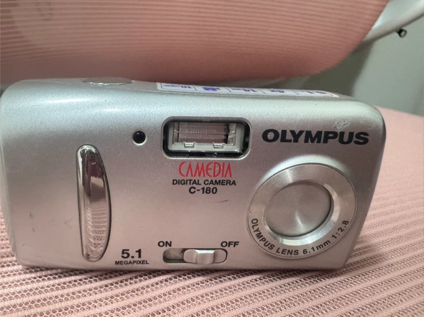 This silver Olympus digital camera is a CAMEDIA C-180 model. It features 5.1 megapixels and a 4x digital zoom. The Olympus lens is 6.1mm 1:2.8. It's a handy device for capturing everyday moments!