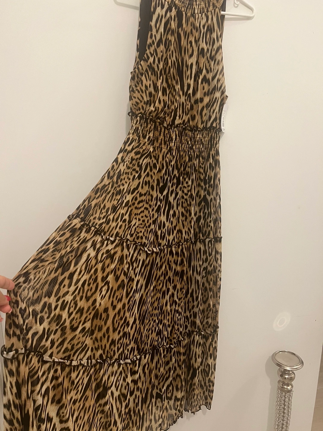 Stunning sleeveless maxi dress. Features a high neckline and tiered skirt. Leopard print. Perfect for any occasion.