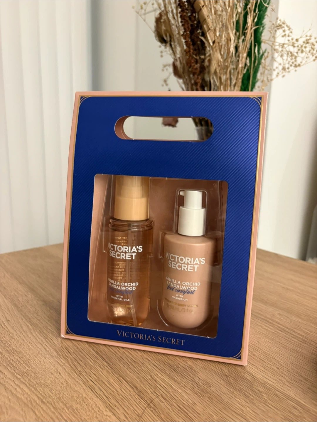 Victoria's Secret Vanilla Orchid Sandalwood fragrance mist and body lotion gift set. The mist is 75 mL and contains essential oils. The body lotion is 60 mL and formulated with magnesium.