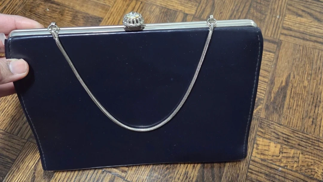 A stylish navy evening clutch with a decorative silver clasp. It's made of a smooth material and includes a delicate silver snake chain. This clutch is perfect for a night out!