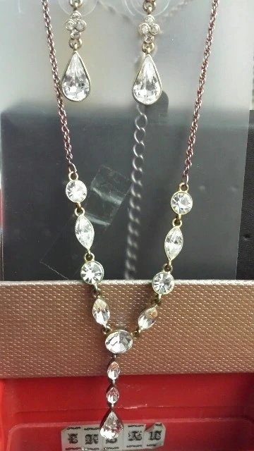 A sparkly rhinestone necklace and matching dangle earrings. The set features a delicate chain and intricate stone detailing. It's perfect for adding a touch of glam to any outfit!
