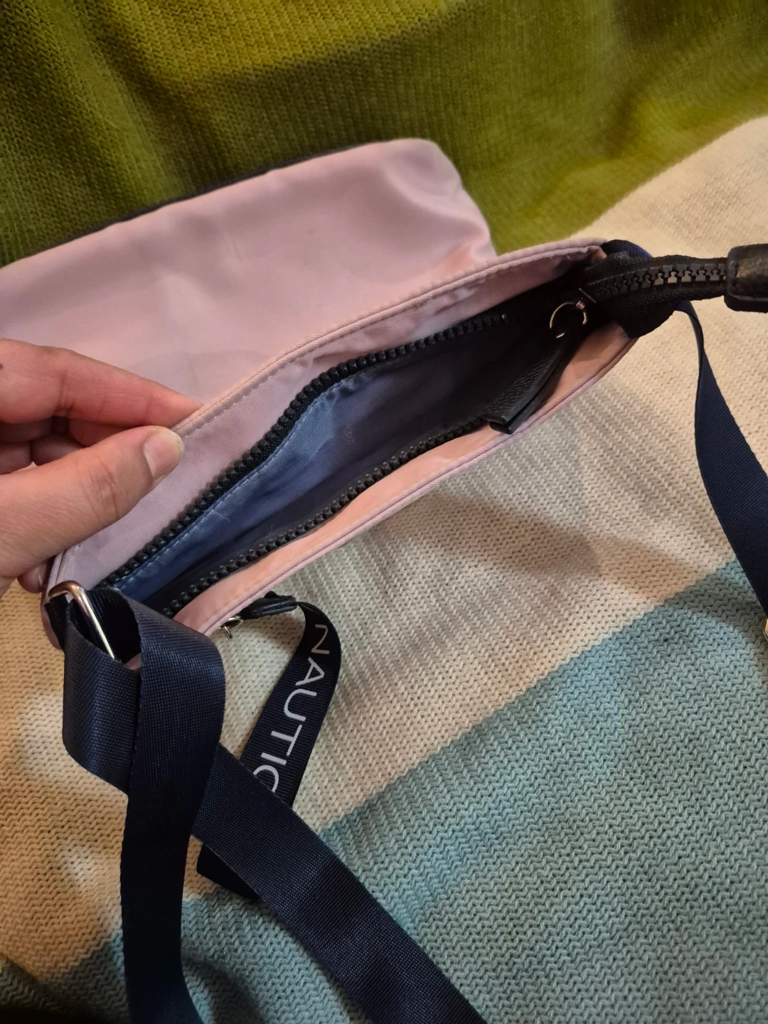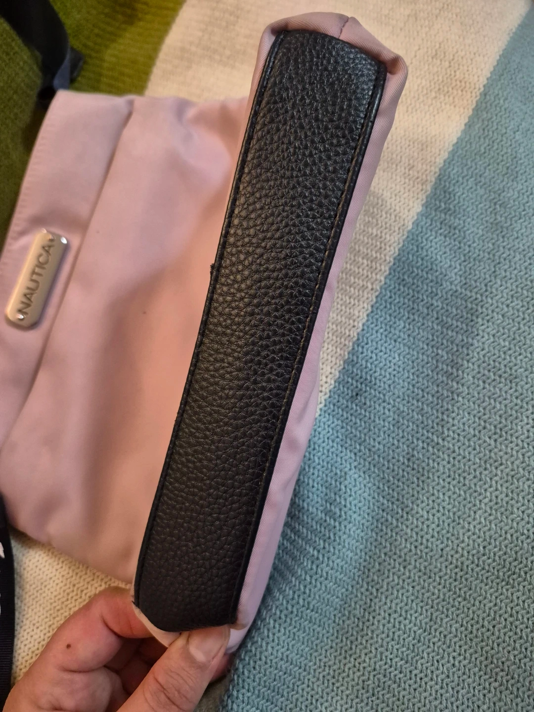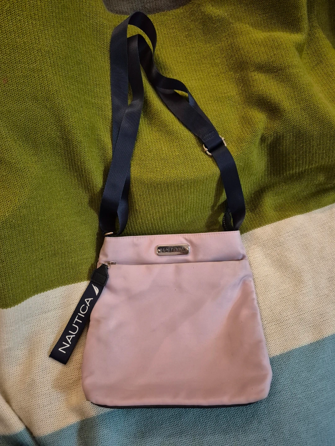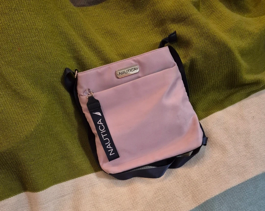 Light pink Nautica crossbody bag with a navy blue adjustable strap. It's made of nylon and has multiple interior pockets. The strap has "NAUTICA" printed on it.
