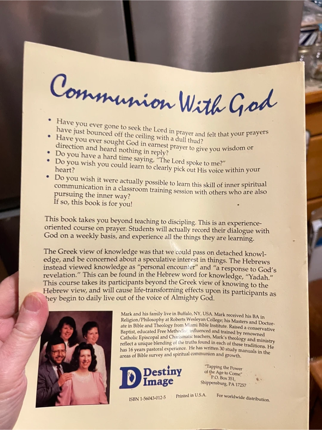This is an experience-oriented course on prayer. Students will actually record their dialogue with God on a weekly basis, and experience all the things they are learning. It takes participants beyond the Greek view of knowing to the Hebrew view, and will cause life-transforming effects upon its participants as they begin to daily live out of the voice of Almighty God. Published by Destiny Image.