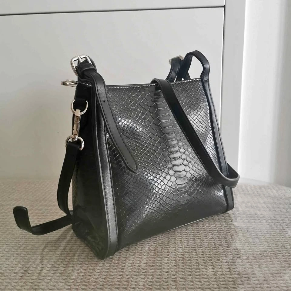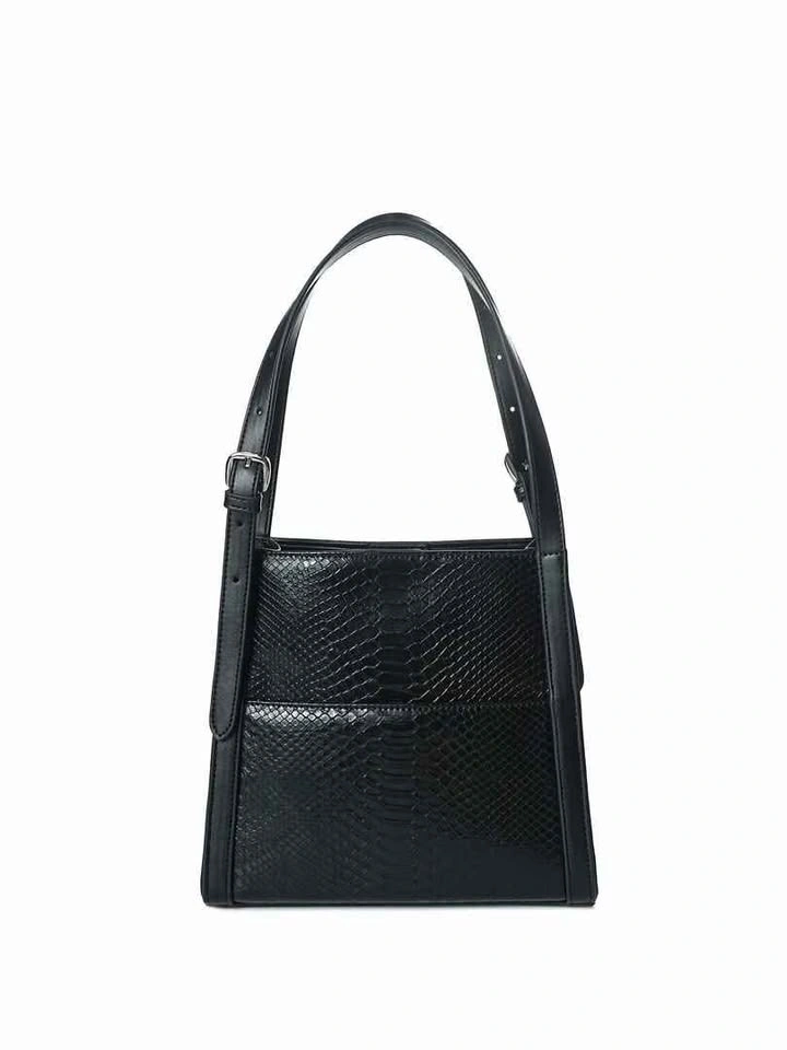 High Deer black leather shoulder bag with a snakeskin pattern. Features an adjustable strap. Size: (L*H*W): 8.5*8*3 inch. Located near Dundas St Downtown Toronto.