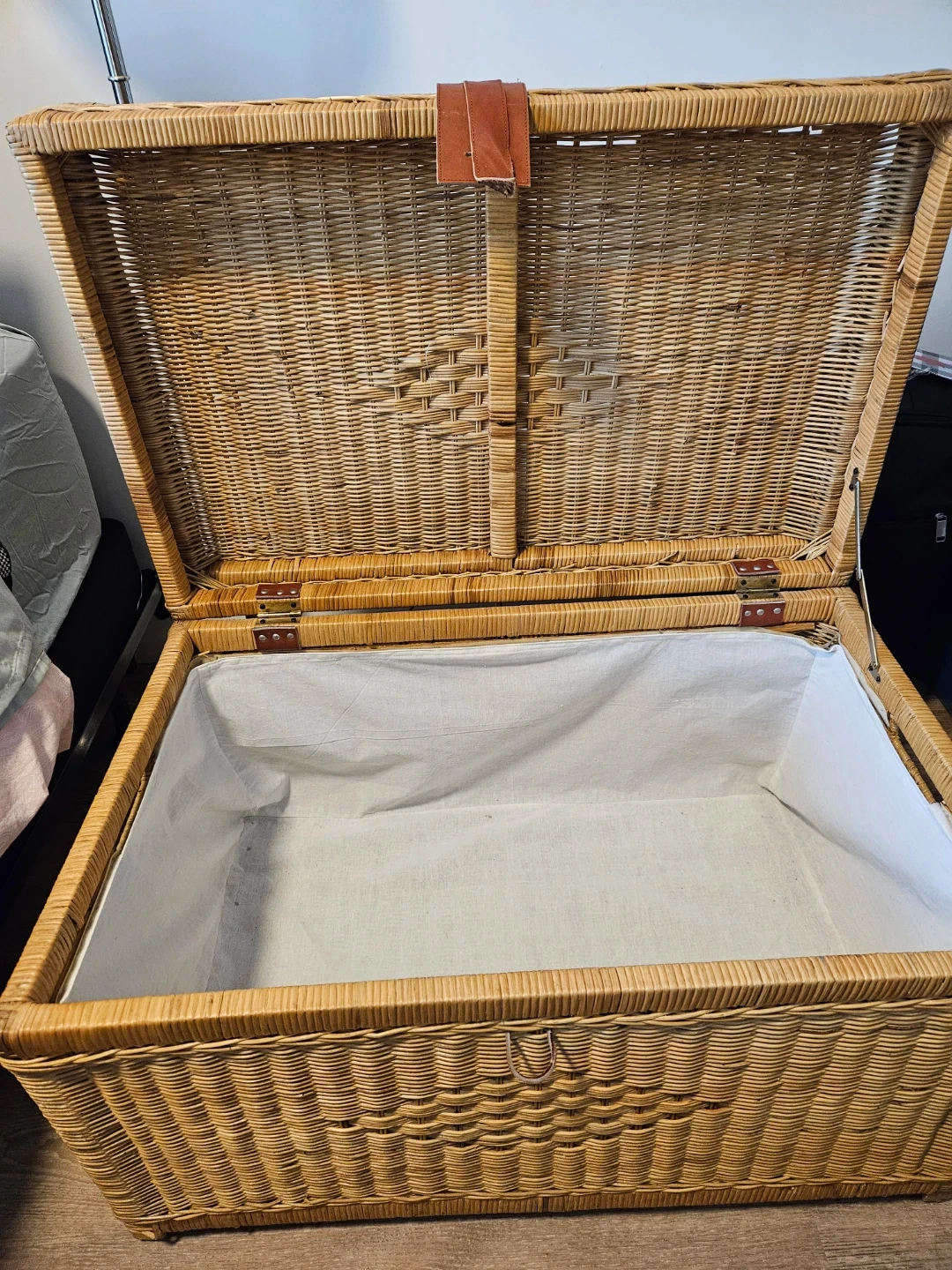 Spacious wicker storage chest with a white fabric lining. It's ideal for storing blankets, toys, or other household items. Features a decorative woven pattern on the lid and a leather buckle closure.
