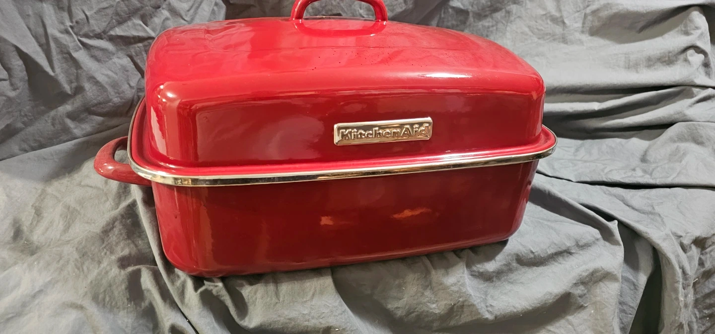 This is a red KitchenAid roasting pan with a lid. It has sturdy handles for easy transport. This pan is great for roasts and poultry!