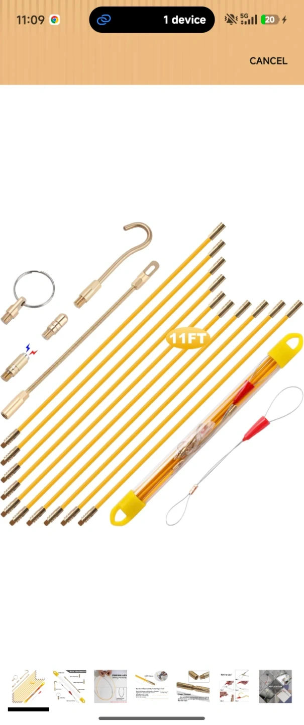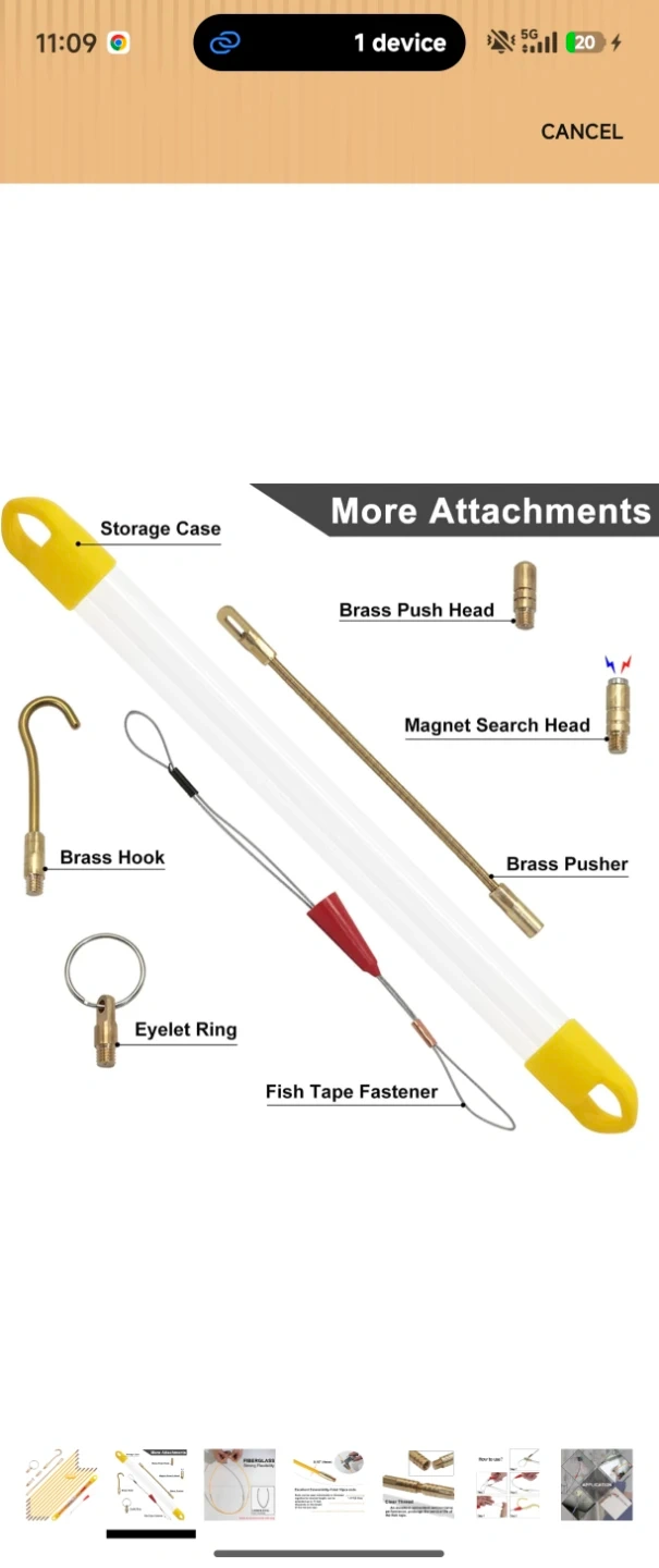 This 11FT fish tape kit includes multiple attachments for pulling wires. It comes with a brass hook, eyelet ring, brass push head, and magnet search head. The kit includes a storage case for easy organization.