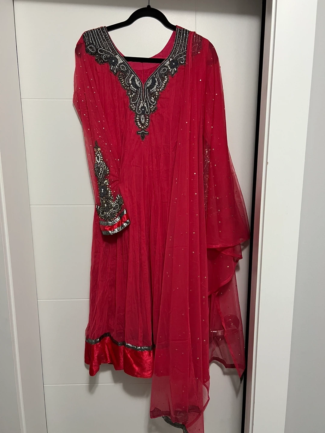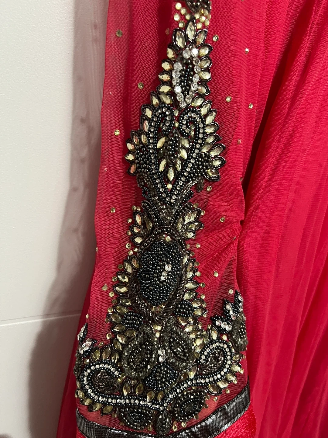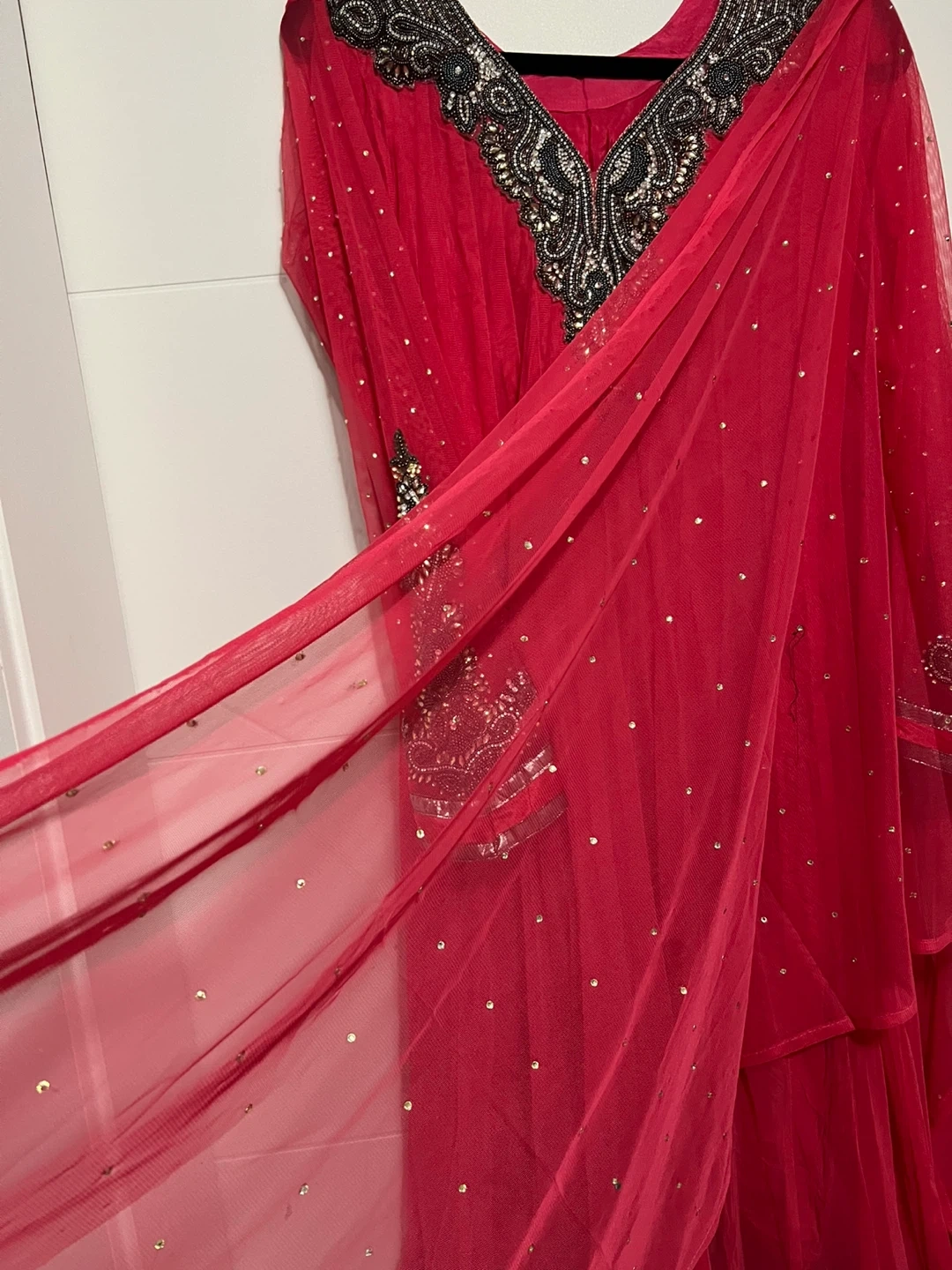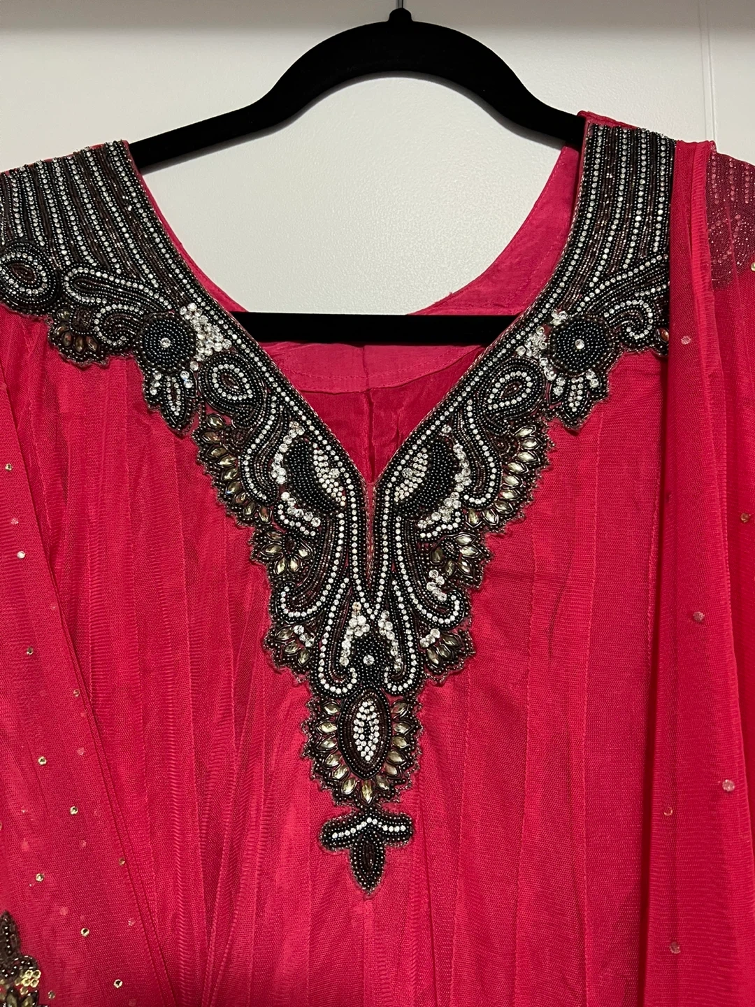 This stunning pink tunic dress features intricate beadwork around the neckline and sleeves, with shimmering gold accents. It comes with a matching sheer dupatta for a complete look. Perfect for festive occasions!