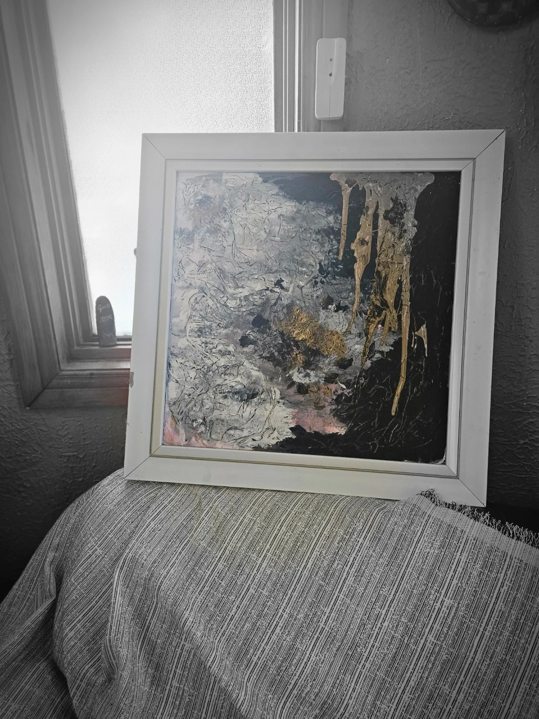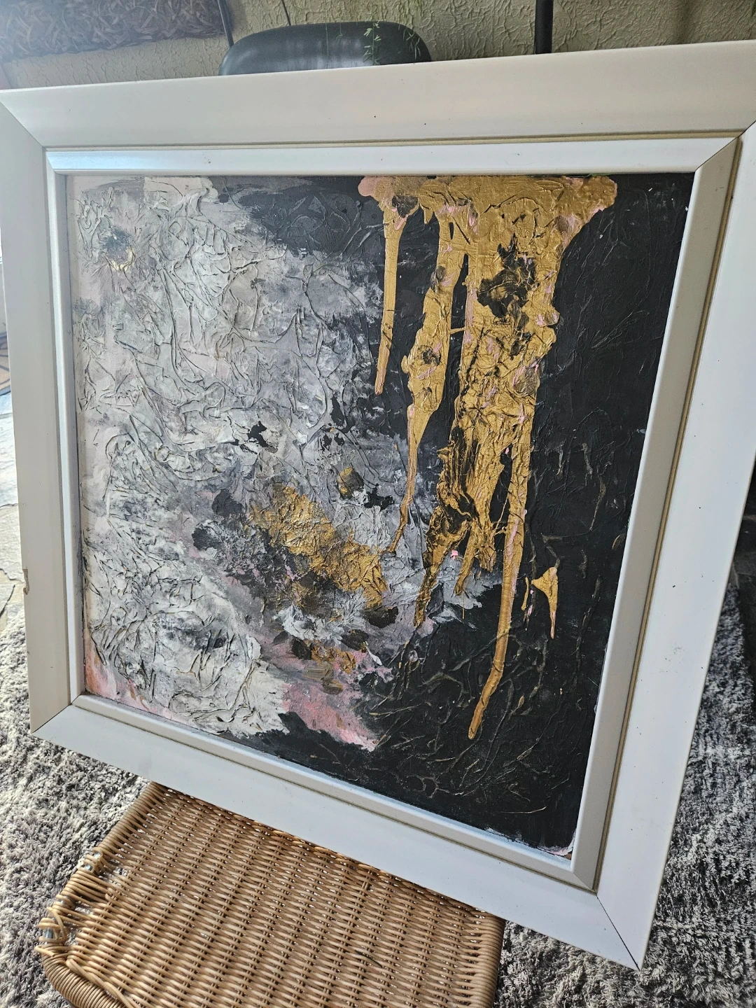 Unique abstract painting with a striking contrast of white and black textures, accented with gold detailing! It's framed in a clean white frame, ready to add a modern touch to your space