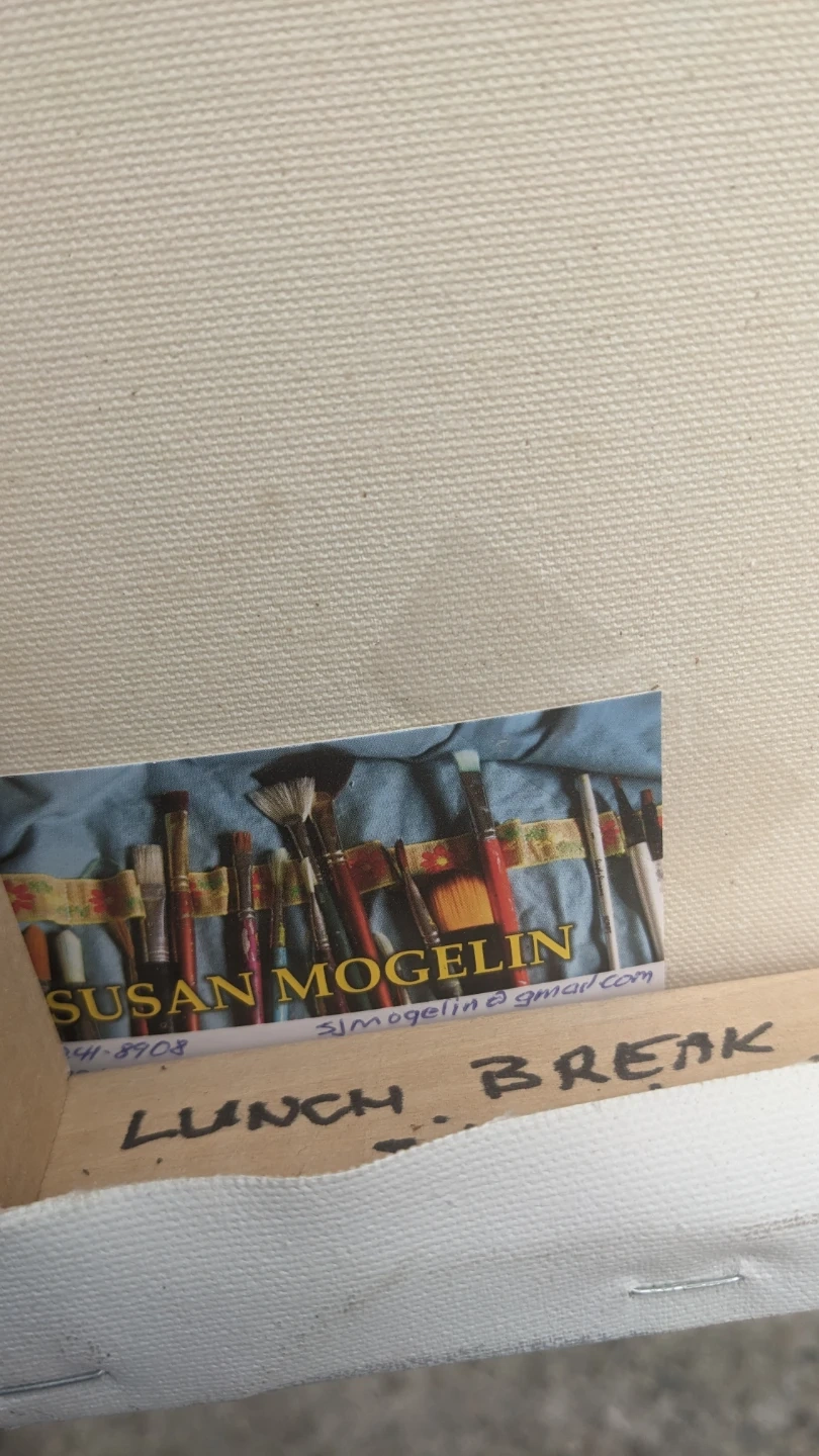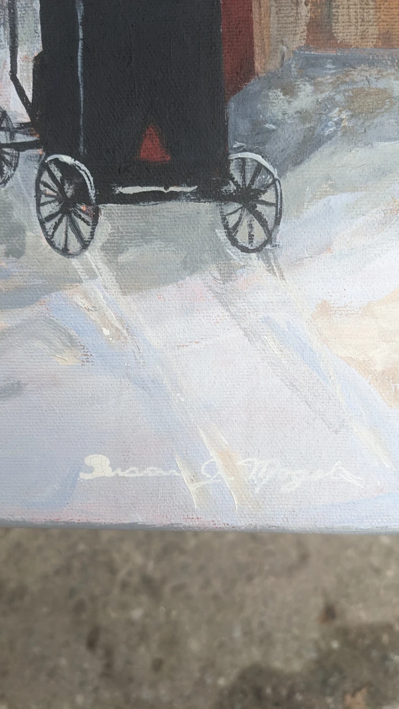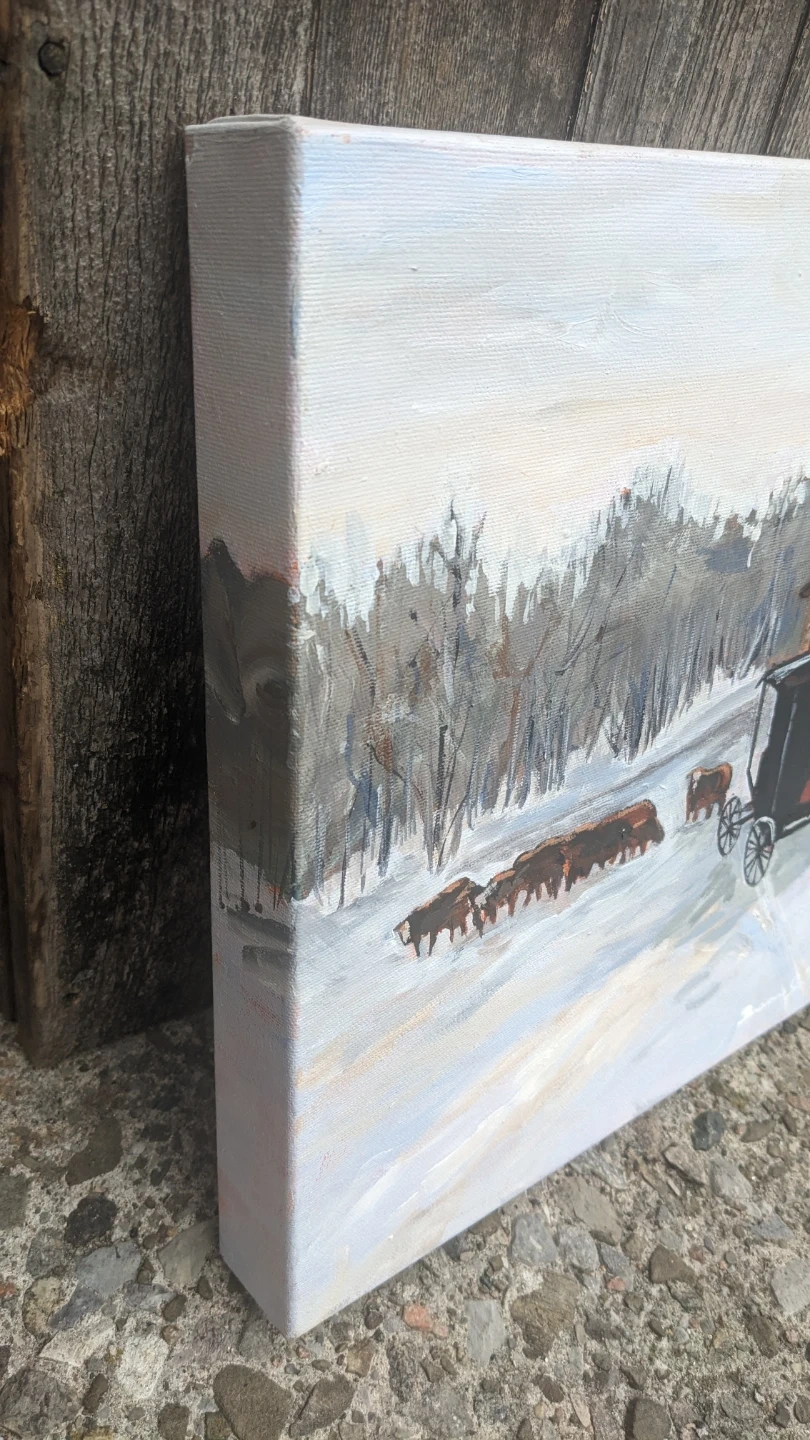 This is an original acrylic painting on canvas depicting a winter scene with a horse-drawn buggy and cattle near a barn. The artist's signature is visible on the front. A business card for artist Susan Mogelin is attached to the back. It's a lovely piece for home decor. Perfect for adding a touch of rustic charm to any room!