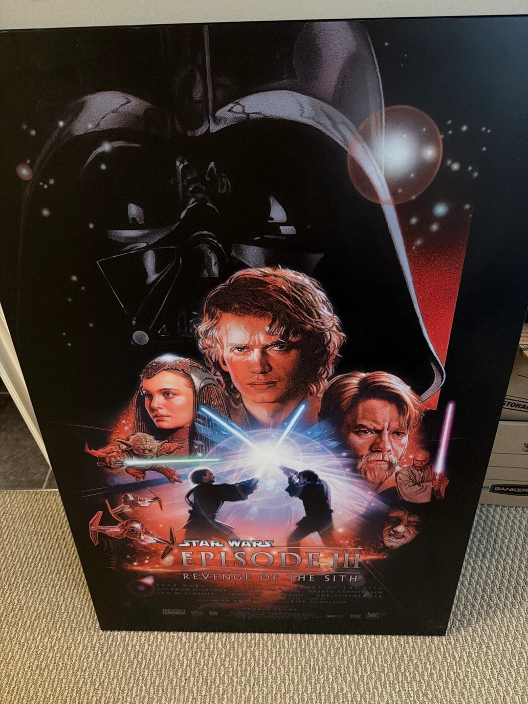 This is a poster for Star Wars Episode III: Revenge of the Sith. It features the main characters and iconic imagery from the film. The poster has a "PLAK-IT" label on the back, indicating a mounting system.