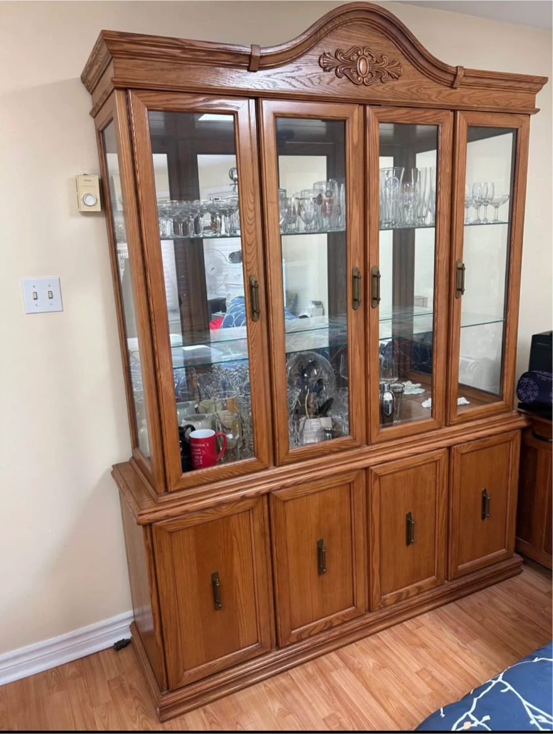 Open to Offers Oak China Cabinet with Glass Display and working light in glass display. Excellent condition, all cupboards and the drawer work. No chips or cracks in any of the glass. You will need help moving this piece. There will not be anyone here to help. You will also need a way to transport. It does come apart into two pieces If you want more pictures or video let me know Measurements Top piece Height: 56 1/2 inches Width: 15 1/2 inches Length: 60 inches Bottom Height: 29 inches Width: 17 inches Length: 63 inches